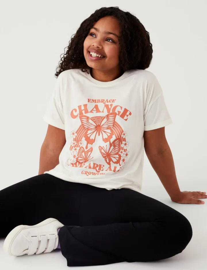 This cheerful pure cotton t-shirt will bring good vibes to casual days. Made in a comfy regular fit. Playful print of butterflies and flowers, surrounded by the encouraging words ‘Embrace change – we are all growing.’