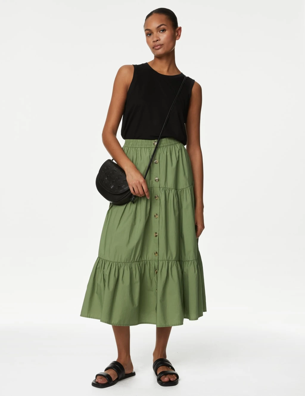 This pure cotton midi skirt brings casual style to your warm weather wardrobe. It’s cut in a regular fit and features an elasticated waist for comfortable wear. A button-through fastening and gathered tiers complete the timeless design. M&S Collection: easy-to-wear wardrobe staples that combine classic and contemporary styles.