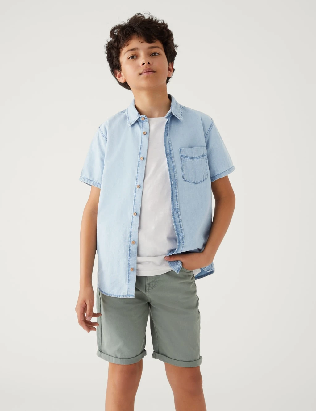 This pure cotton chambray shirt will make little ones look stylish in an instant. Regular fit, with short sleeves that can be rolled up for a more casual look. Features a neat collar and smart button fastening down the centre. The comfortable fabric has a cool denim look.
