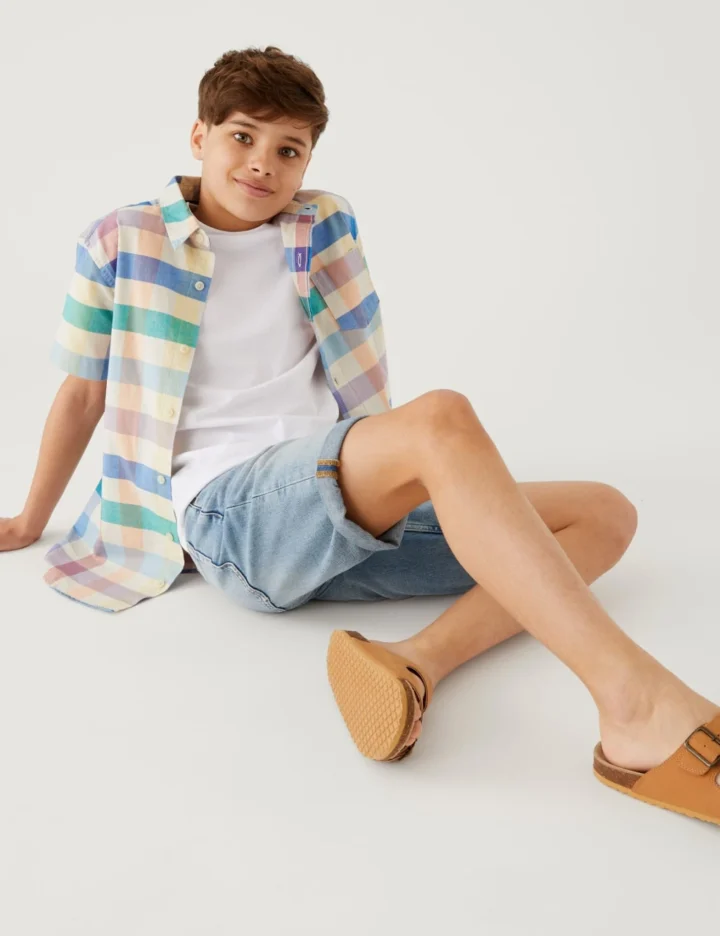 This pure cotton shirt is perfect for a party or any time they’re feeling colourful. Comfy regular fit, with airy short sleeves and a collared neck. The cheerful checked pattern is also available in menswear for a Mini Me look.