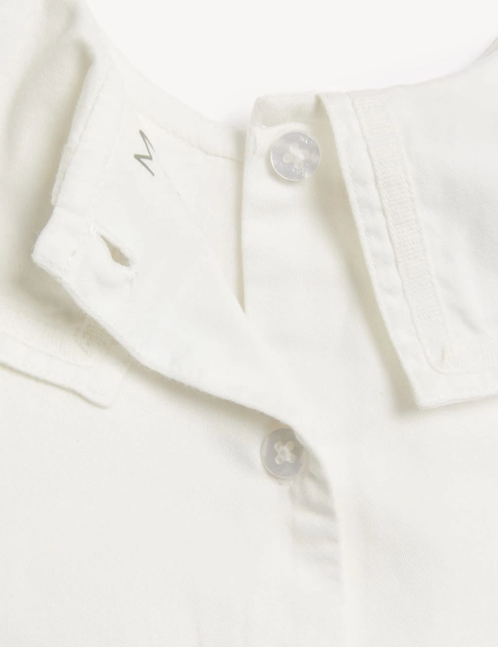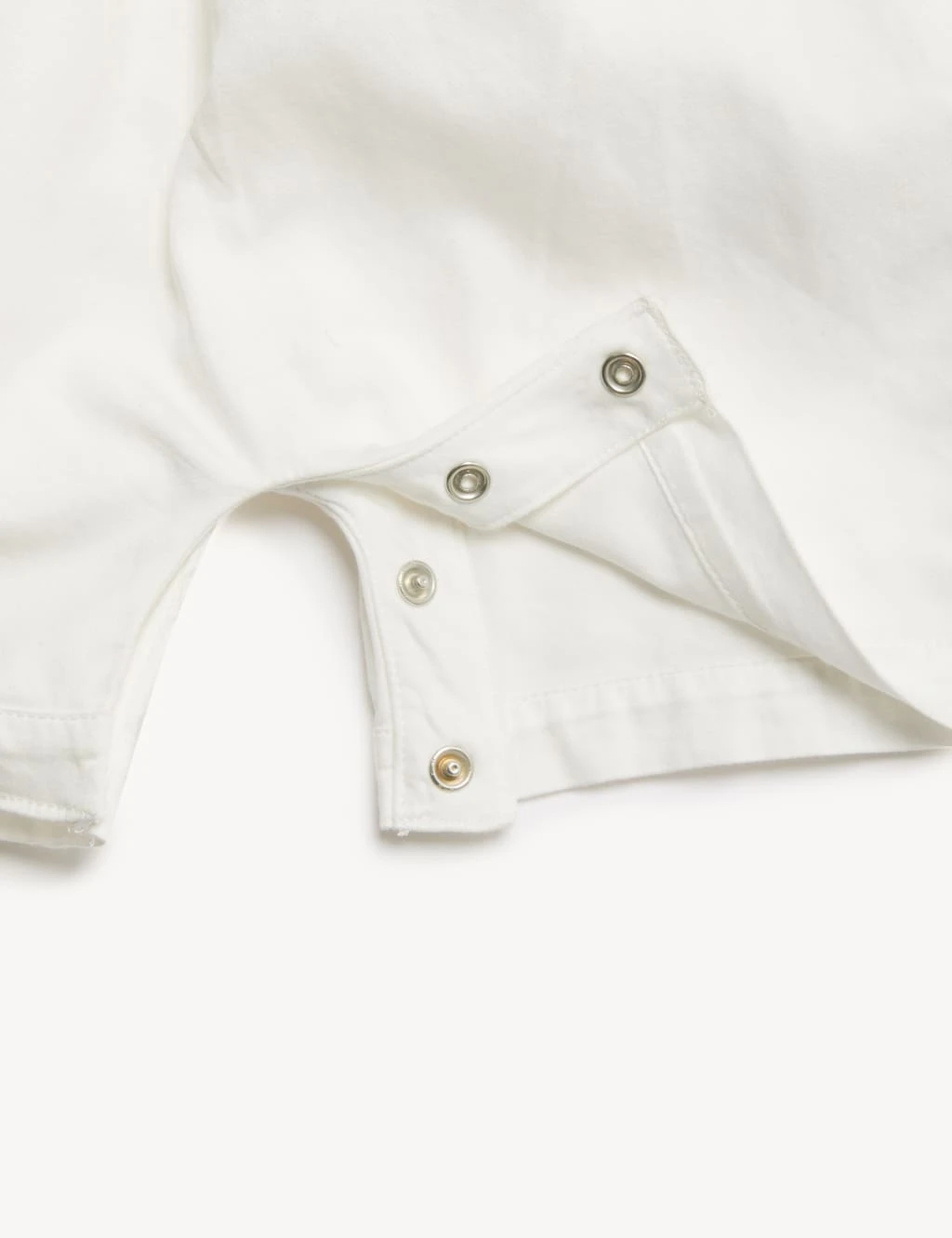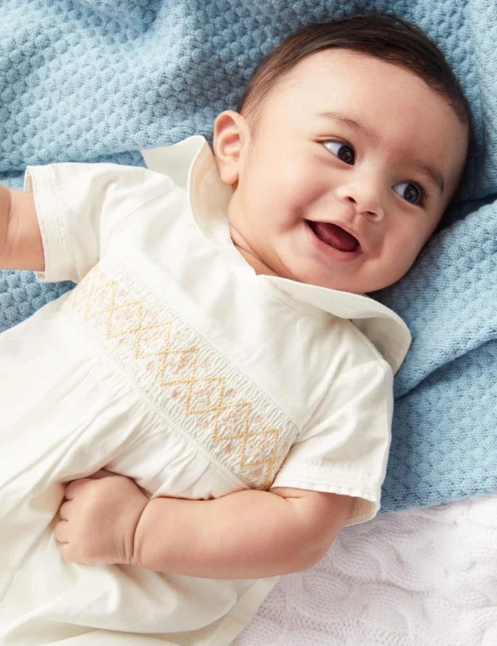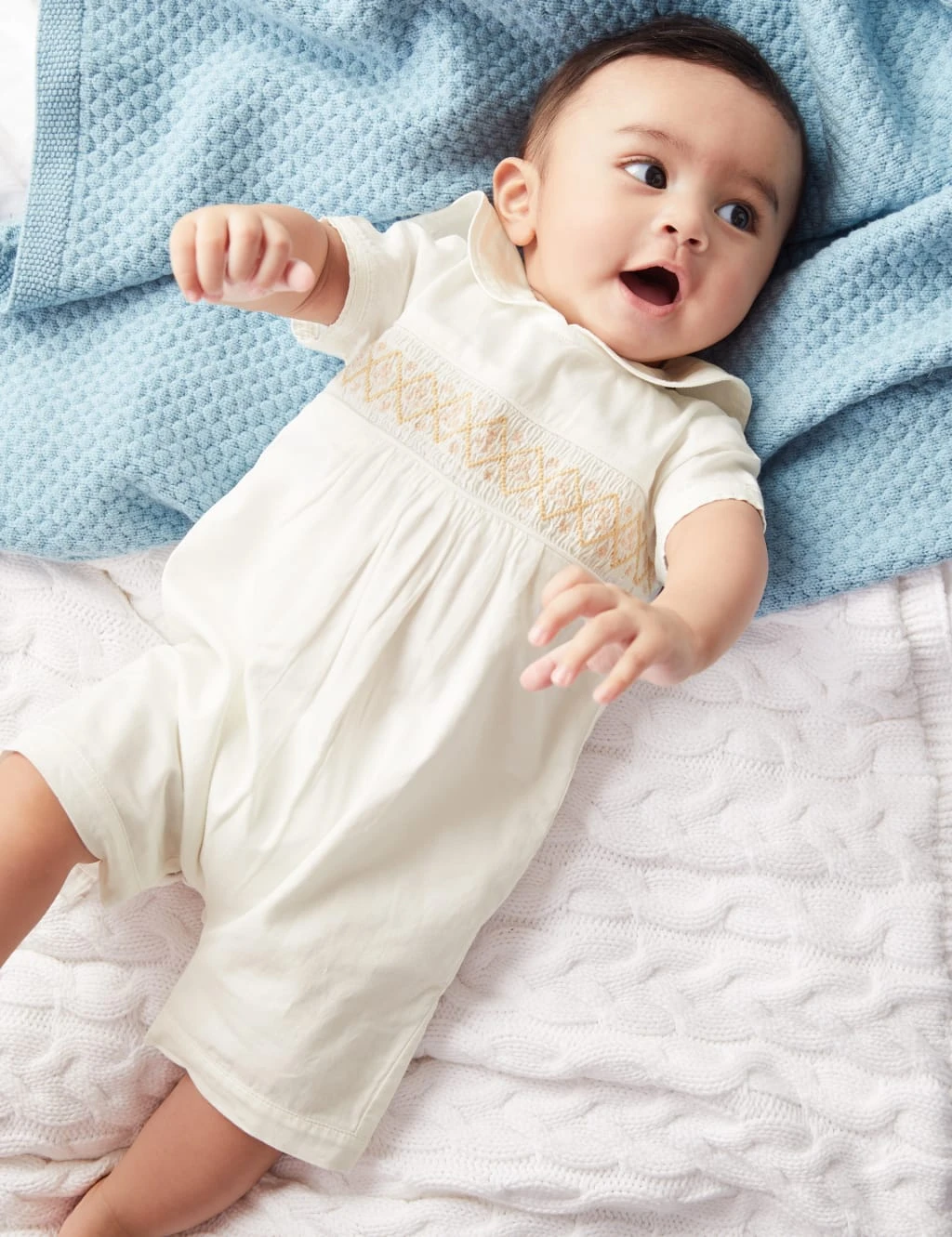 This pure cotton romper is ever-so-sweet with its smocked panel and Peter Pan collar. Gathering at the waist creates room through the body for comfort. Easy poppers at the crotch, as well as neat back button fastenings, make dressing a breeze. Piping on the short sleeves adds a little extra detail.