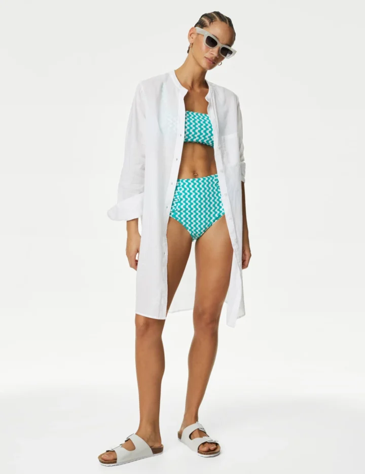 Crafted from pure cotton, this breezy beach cover-up shirt brings effortless elegance to your holiday wardrobe. Cut in a regular fit, the stylish collarless design features a round neck and a button-through front. Side splits in the longline hem allow easy movement, while the chest pocket adds a neat finish.