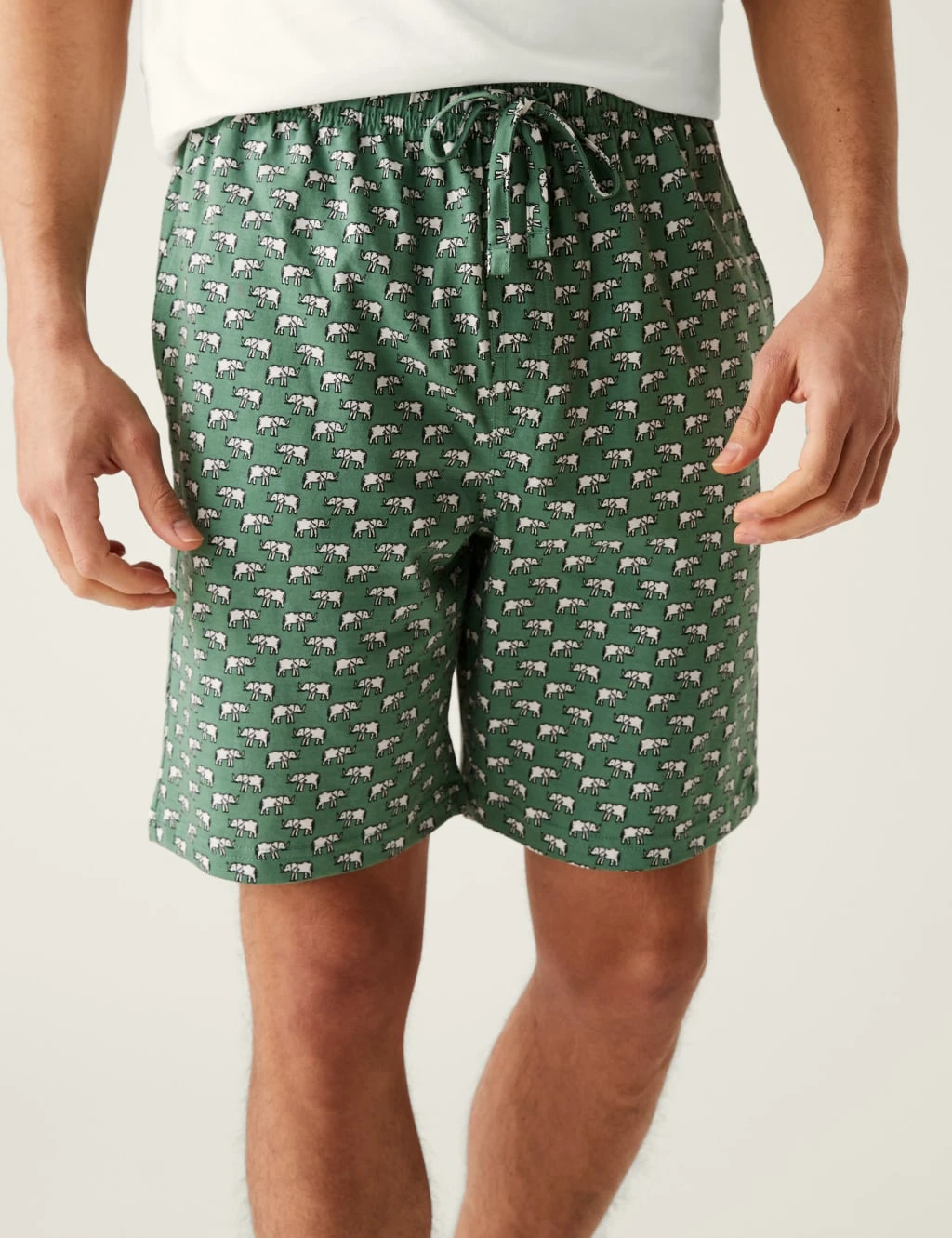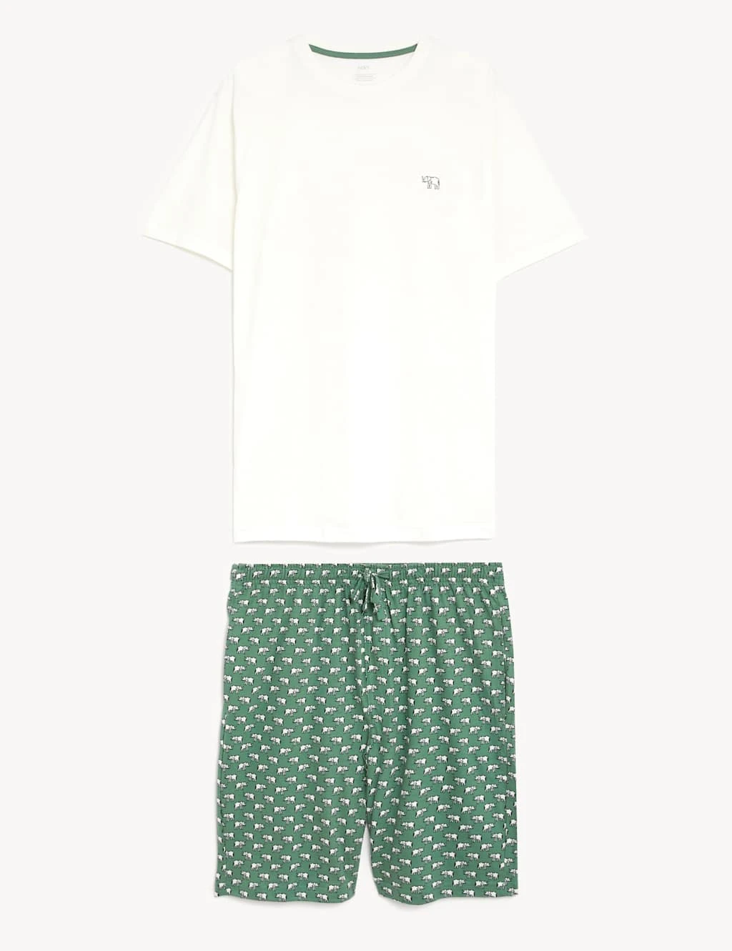 Bring extra fun to your nightwear with this elephant-themed pyjama set, crafted from pure breathable cotton. Comfy regular fit. T-shirt and shorts, with a mock fly, easy drawstring waist and side pockets.