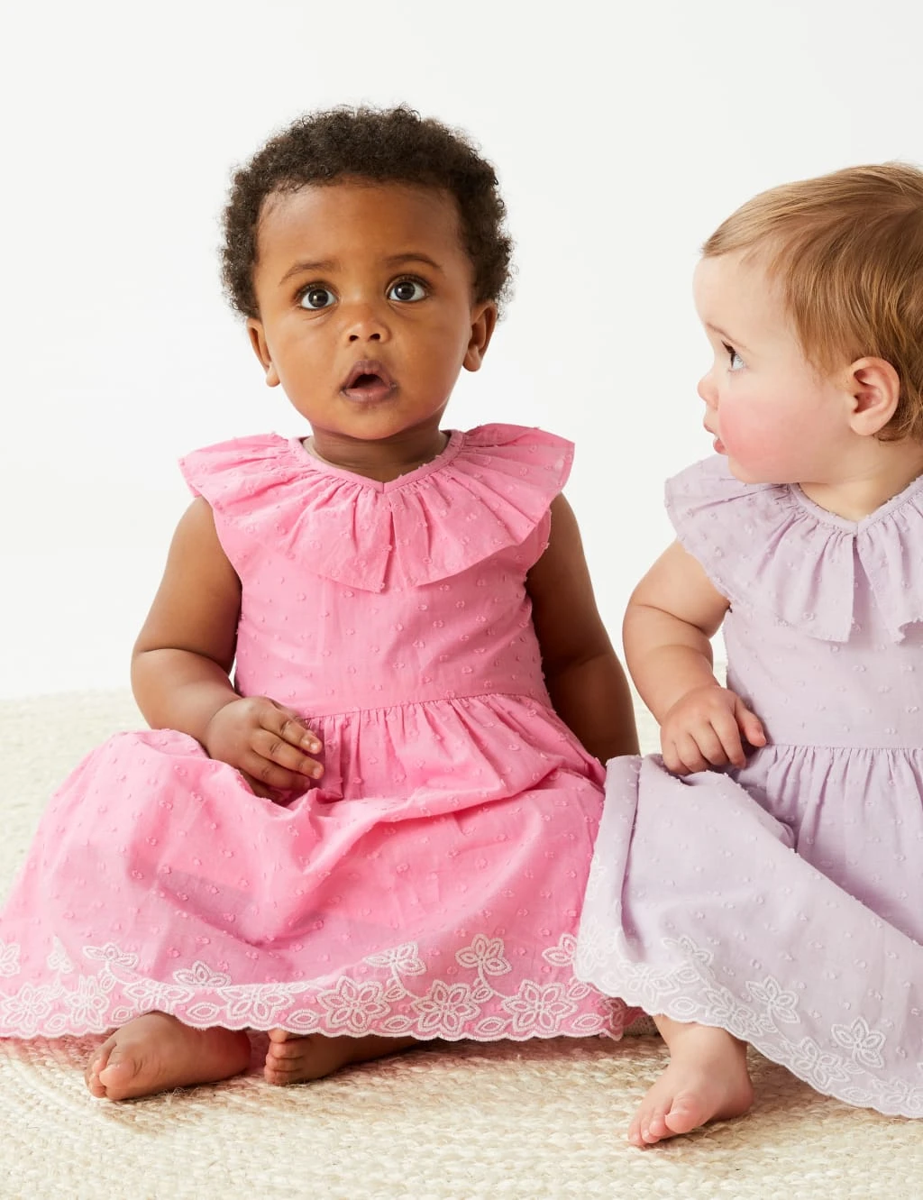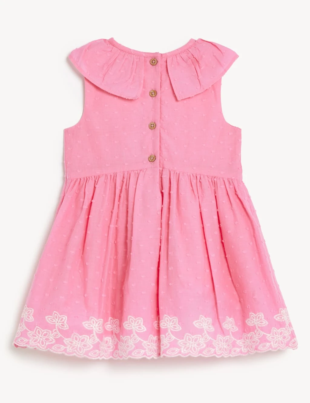 This sweet pure cotton dress is perfect for smarter occasions. The sleeveless style has a pretty frill collar and fastens with a row of buttons. A textured spot pattern and delicate floral embroidery at the scalloped hem add a dainty finish.