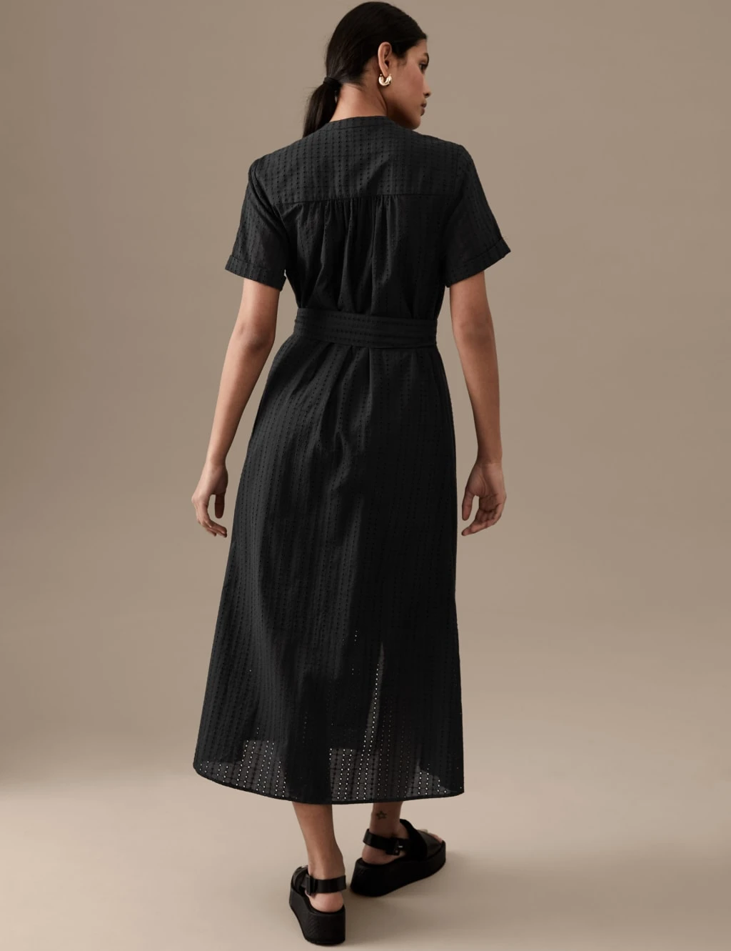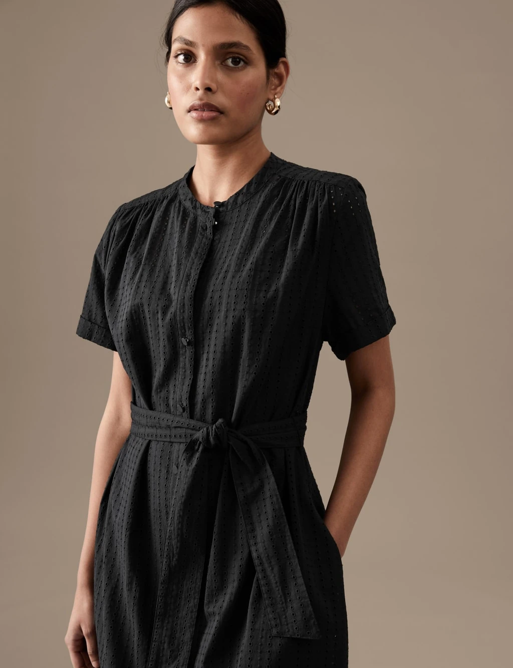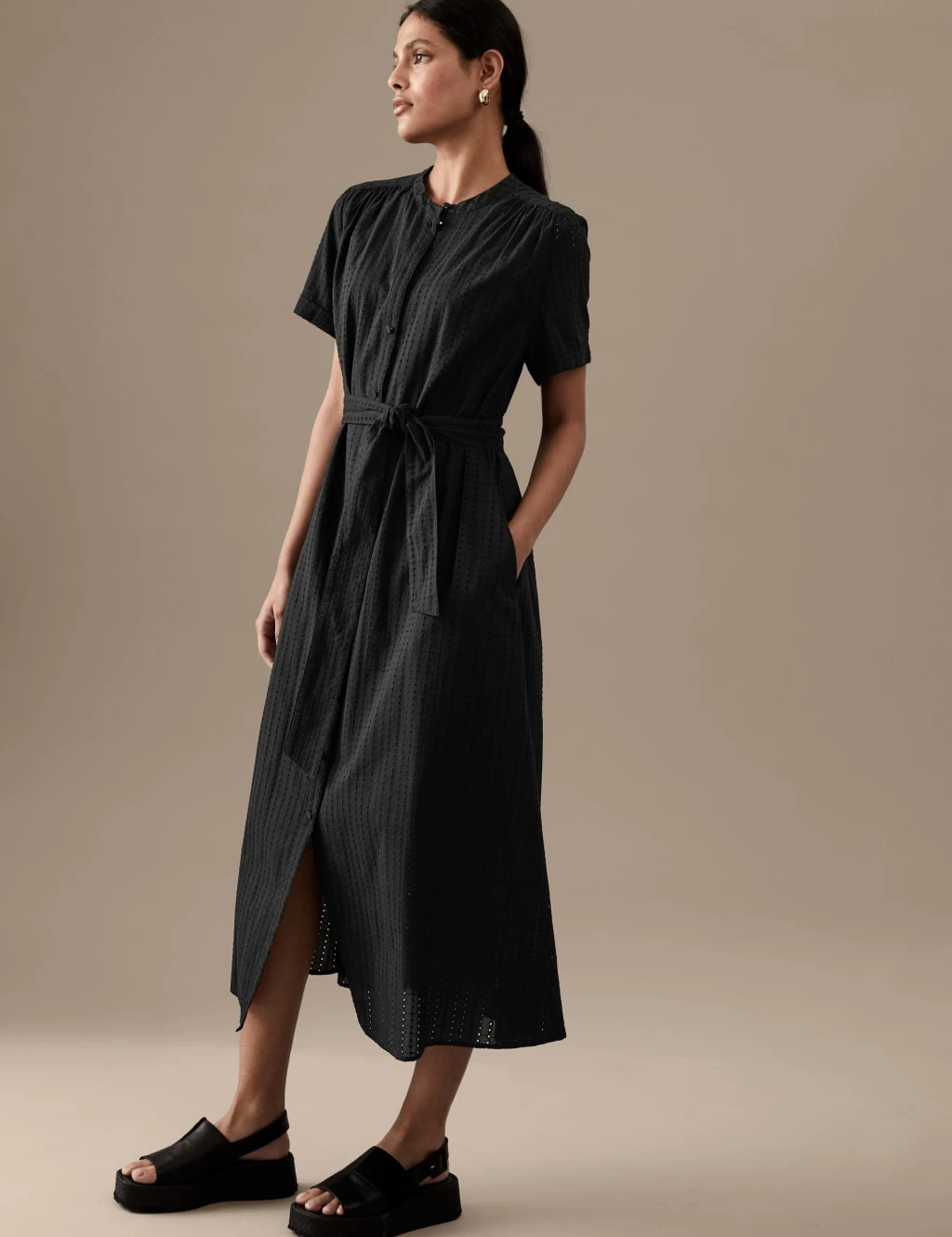 Broderie-style embroidery gives this pure cotton shirt dress from our Autograph collection a breezy look. It’s designed in an easy regular fit, with airy short sleeves and button fastenings running down to the midaxi -length hem. You can cinch in the waist with the matching tie belt, while a slip lining offers extra coverage.