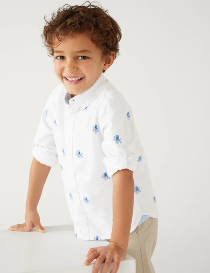 Kids will look smart in this pure cotton Oxford shirt. Comfortable regular fit with a collared neck. The design features an embroidered motif across the body and sleeves.