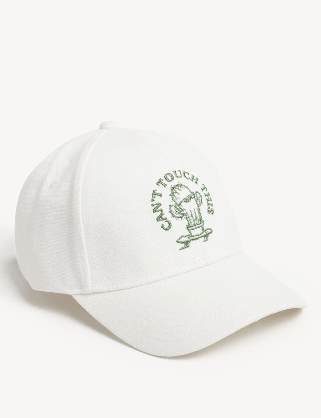 Add a playful spin to your outfit with this pure cotton baseball cap. Features the embroidered slogan ‘Can’t touch this’ and a whimsical, sunglasses-wearing cactus plant. Finished with an antibacterial, peppermint-oil based layer to keep you fresh.