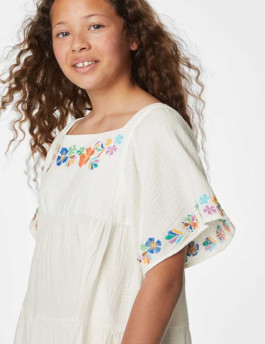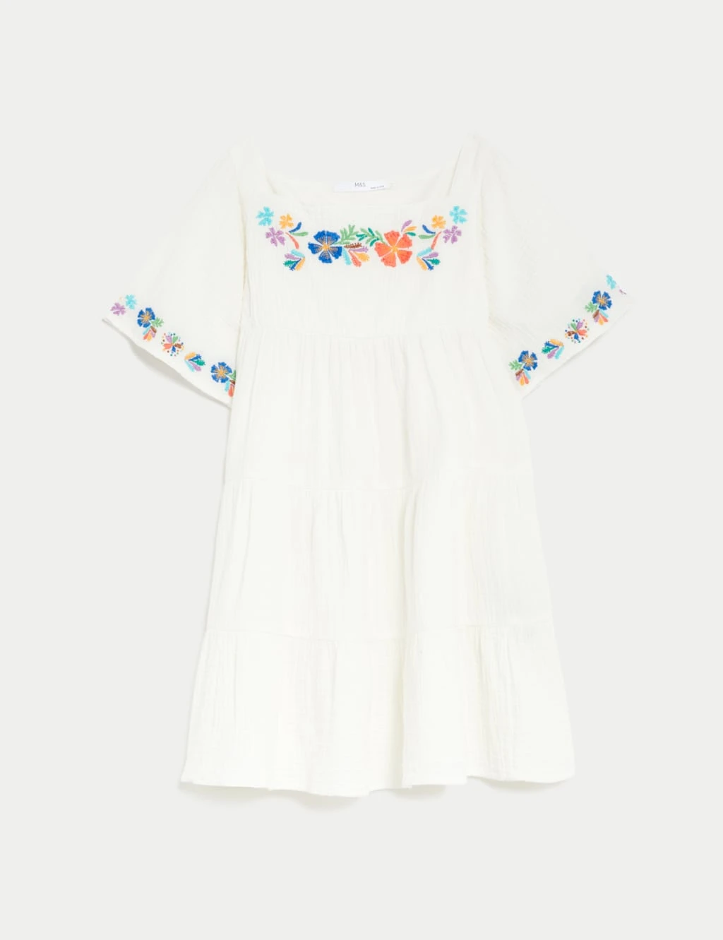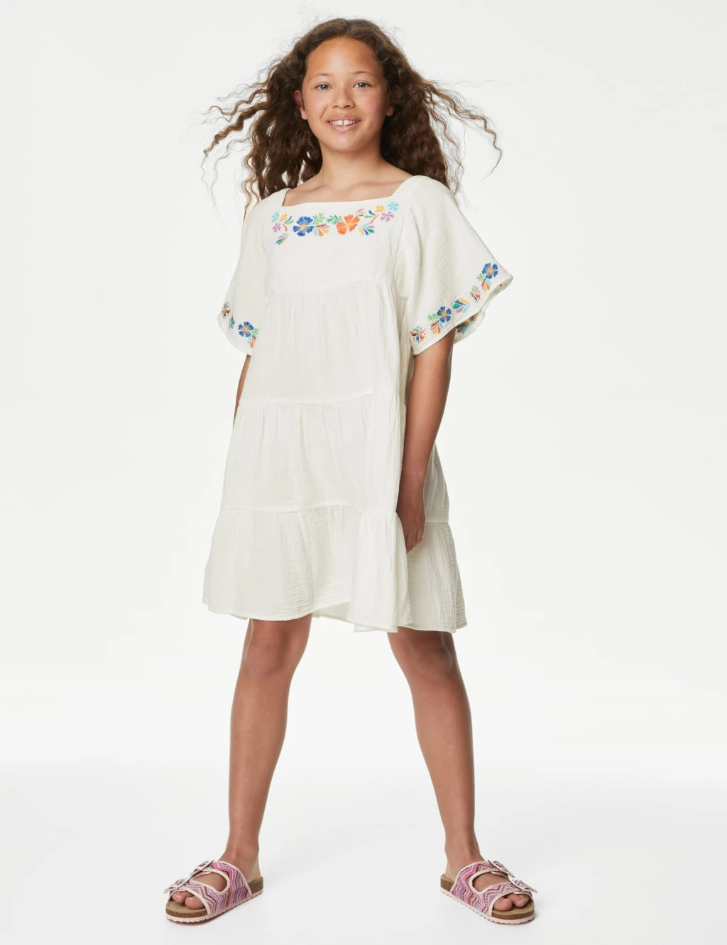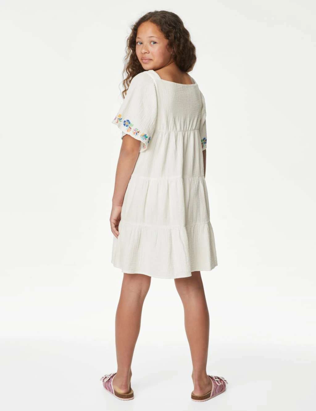 Inject some extra prettiness into their sunny-day wardrobes with this pure cotton dress. It’s designed in a comfy regular fit, with a flowing tiered skirt. Beautiful floral embroidery features below the square neckline and on the short sleeves.