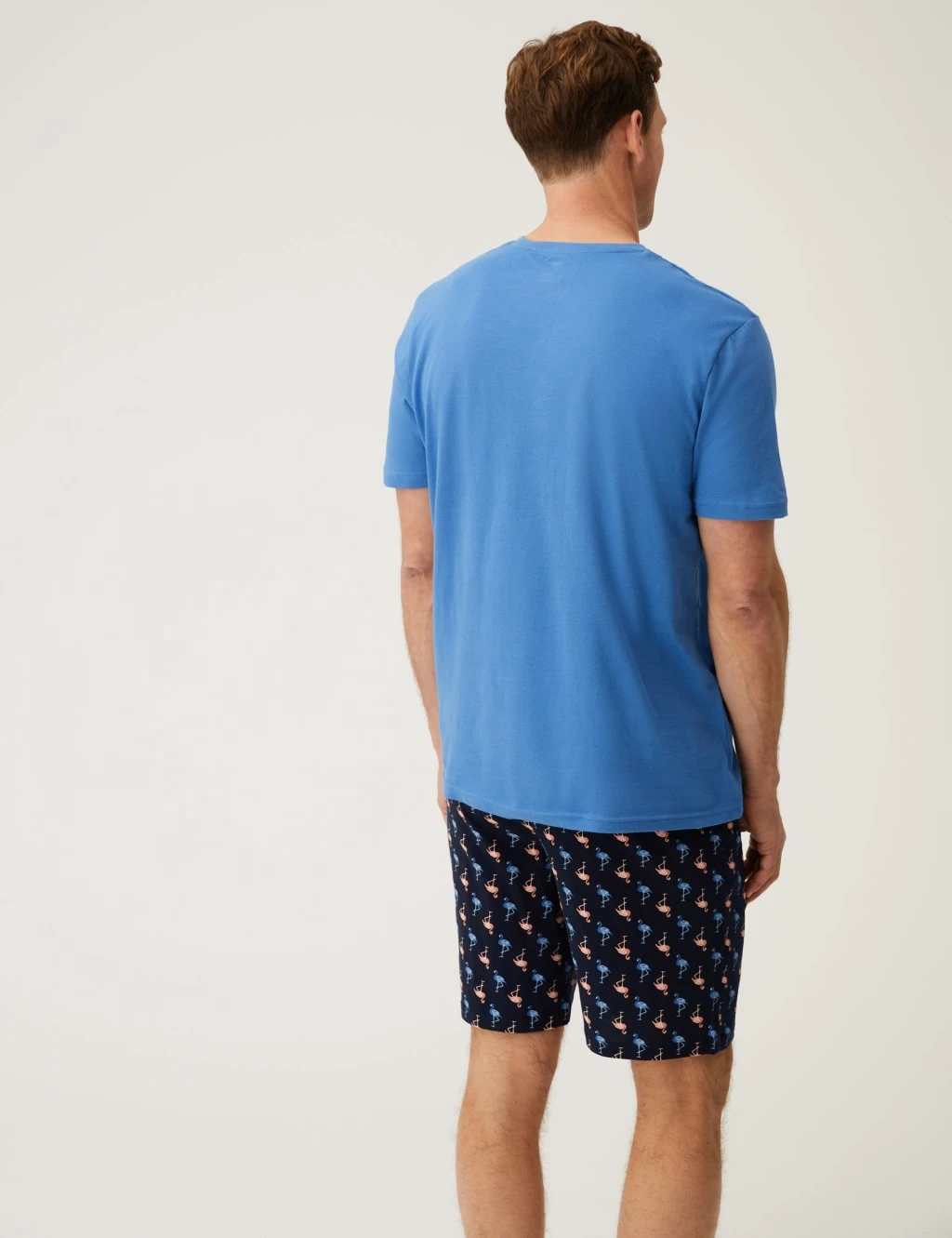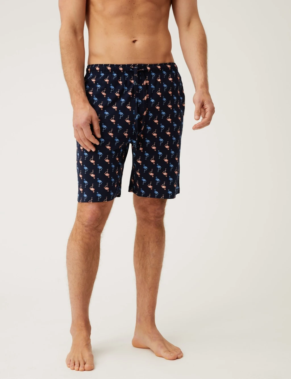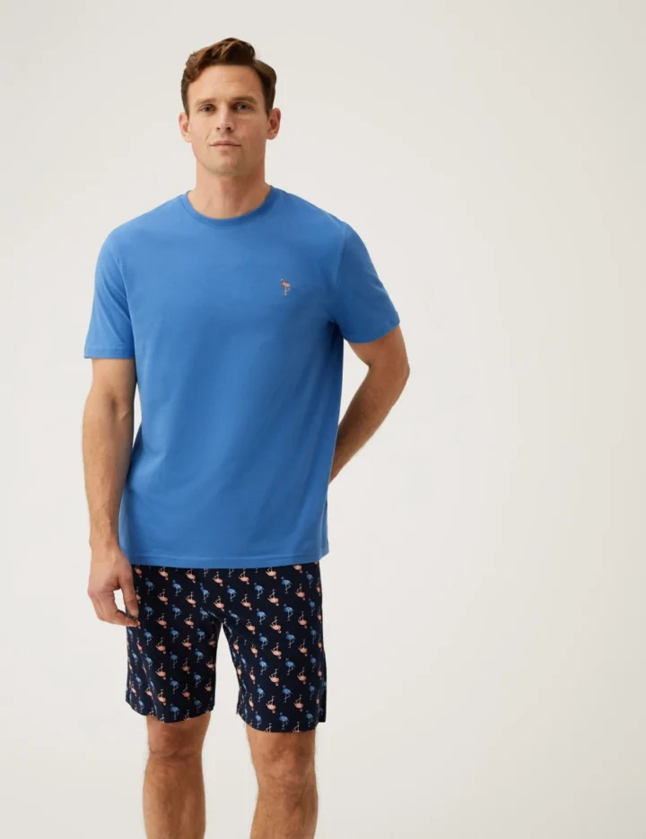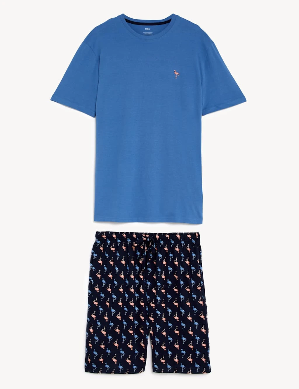 Stand out in style in these flamingo pyjamas. Short sleeves and legs are perfect for warmer nights. Top has a flamingo embroidered on the chest. Shorts have a drawstring waist and a repeated flamingo motif. Made from soft and breathable cotton.