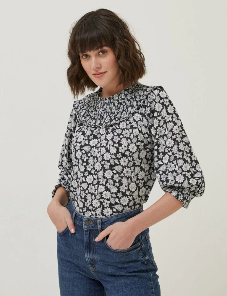 Pure Cotton Floral Crew Neck Shirred Blouse