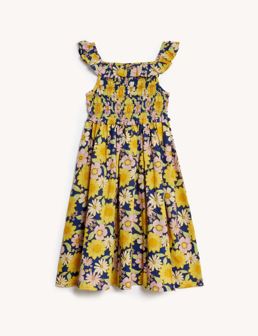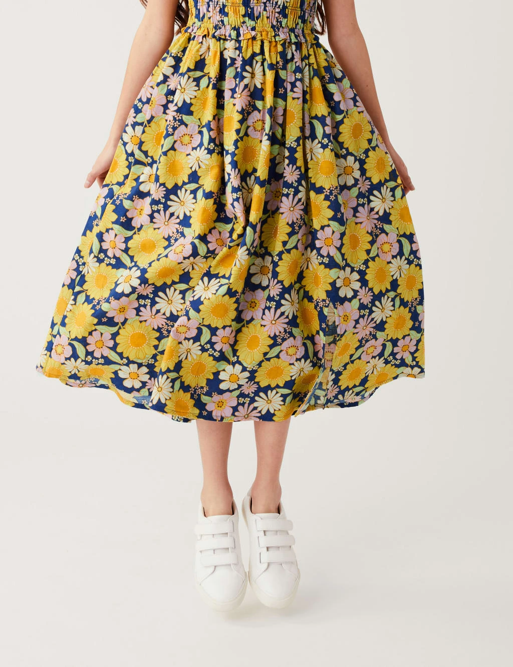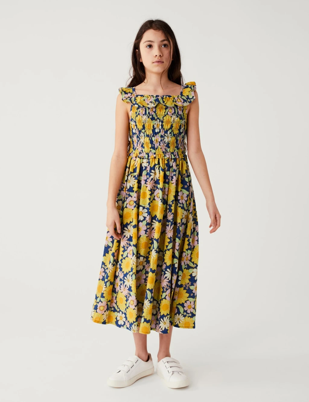 Decorated with cheerful sunflowers, this pure cotton midi dress is perfect for summery days. Comfy regular fit in a breezy sleeveless design. A frilled neck and shirring across the bodice creates an extra pretty look.