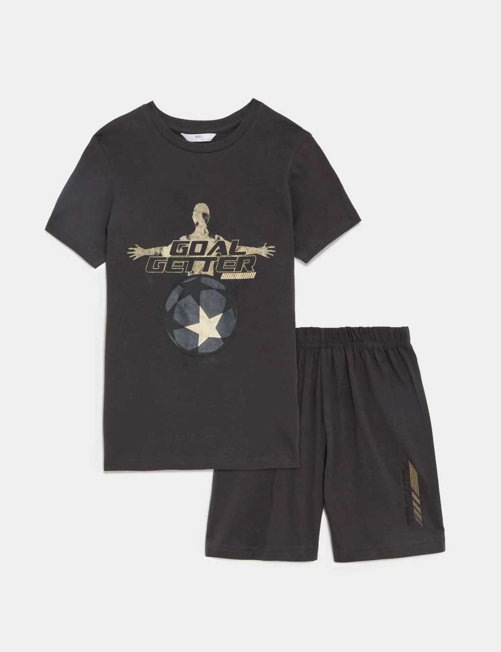 Young football fans will love these pure cotton pyjamas. Two-piece set, cut in a comfy regular fit. Includes pull-on shorts with an elasticated waist and a t-shirt with a fun ‘Goal Getter’ slogan.