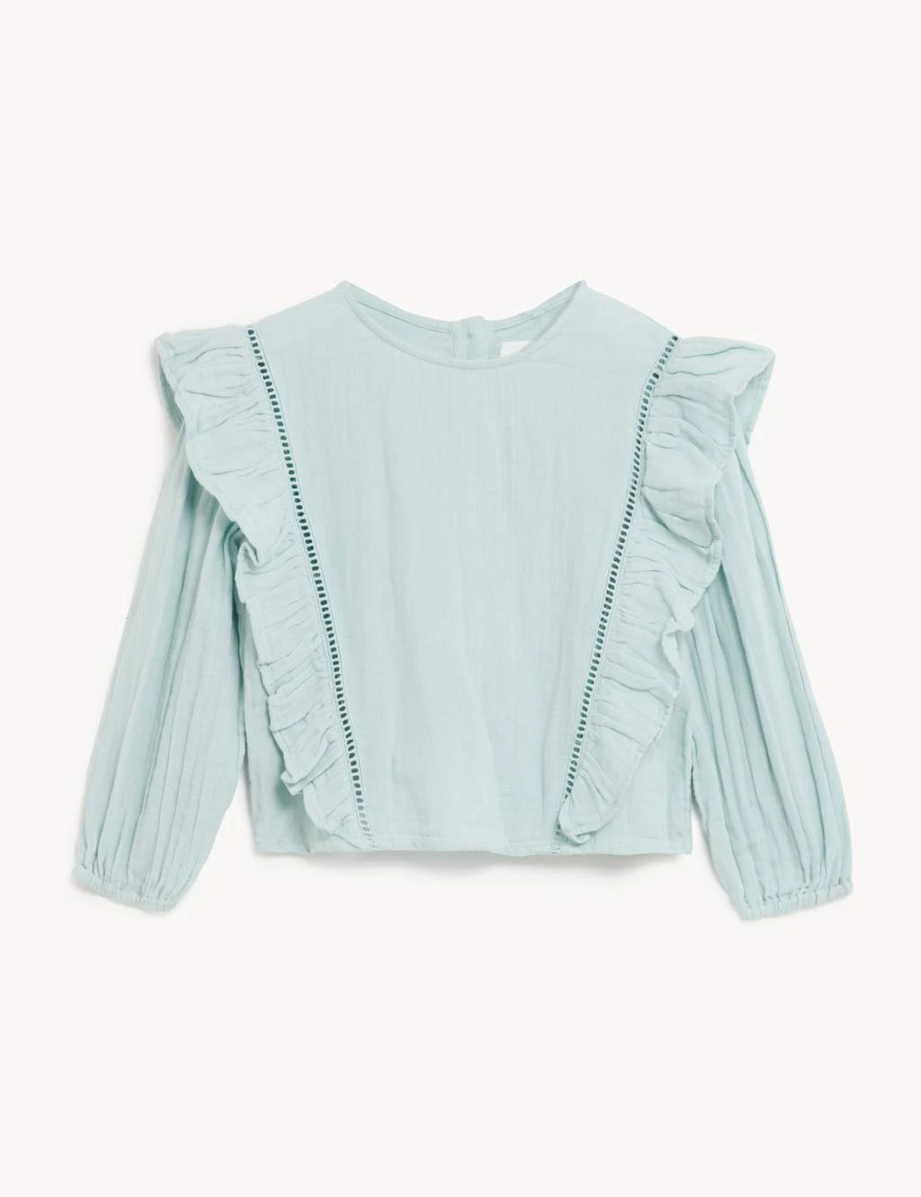 Crafted from pure cotton, this blouse is a casual and cute option for weekend plans. Classic regular fit, with a simple round neckline. Long sleeves with elasticated cuffs for comfort. Complete with sweet frills.