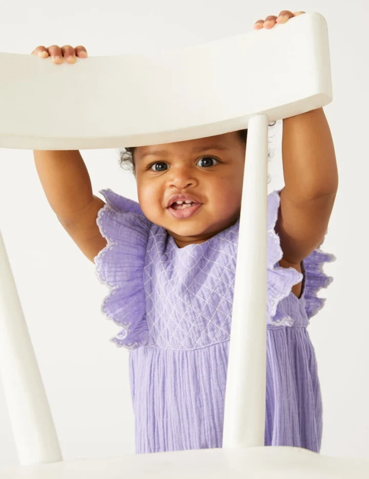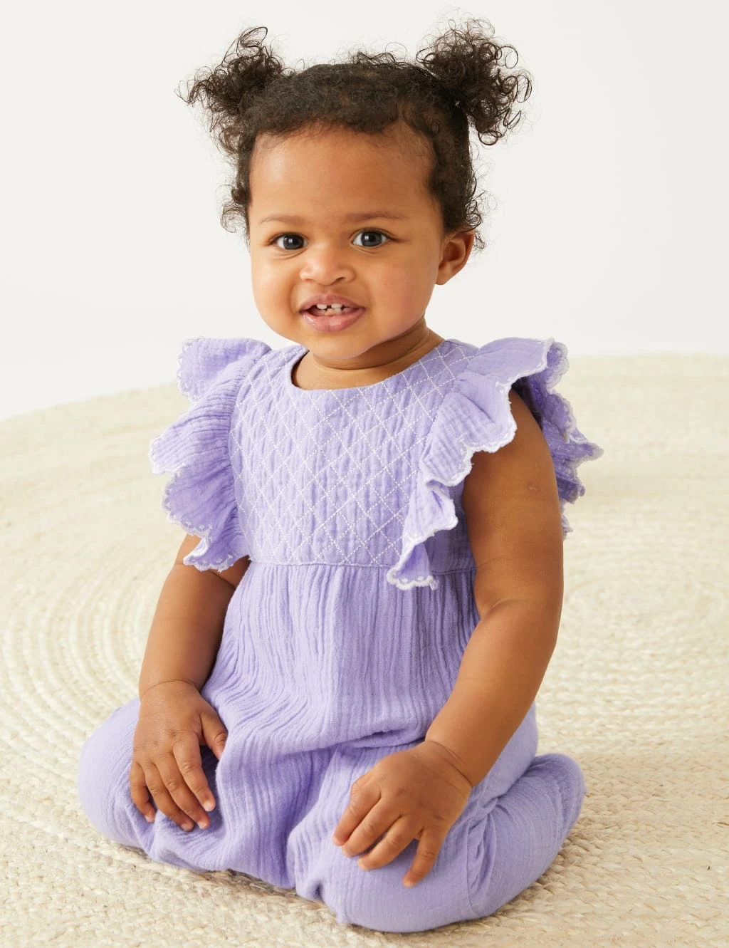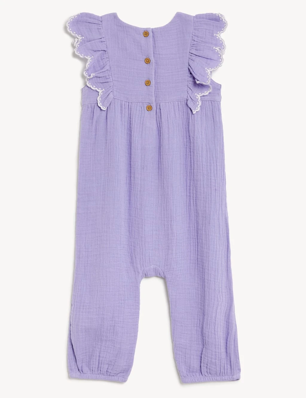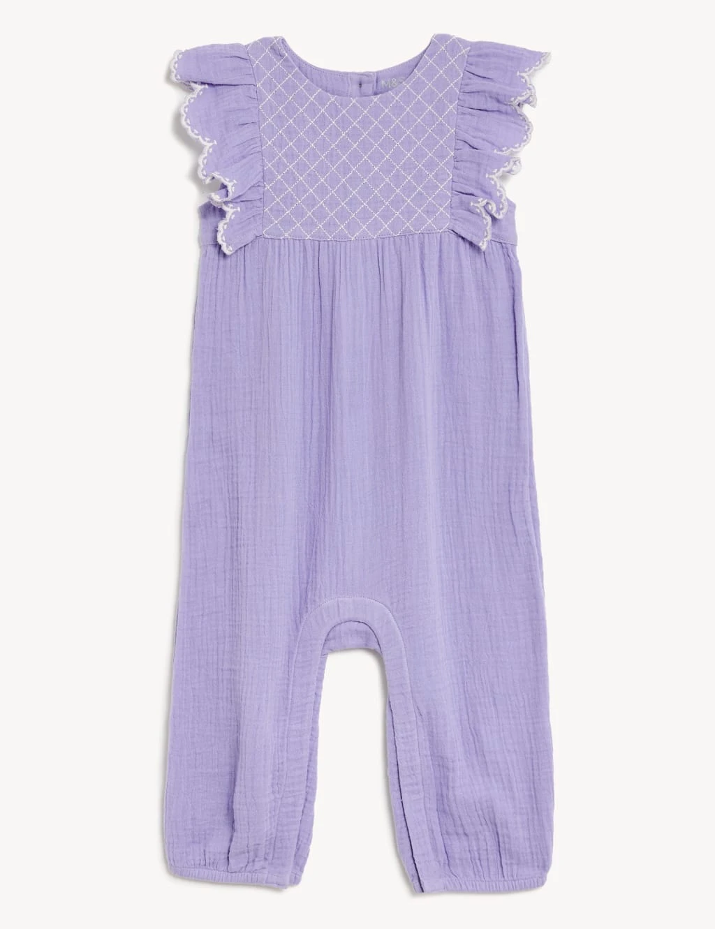 A double cloth construction lends a lovely textured feel to this cotton romper. This piece fastens at the back with a row of neat buttons, while poppers at the nappy area make changing that bit easier. Flat seams are gentle against delicate skin. Cute details include frilled cap sleeves and an embroidered yoke.