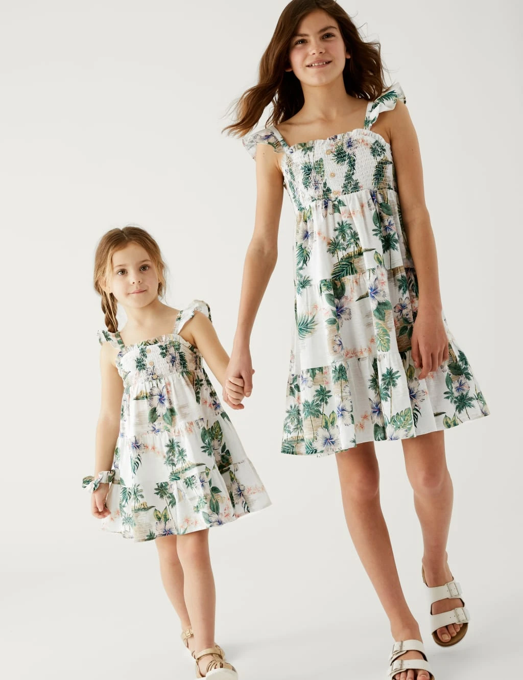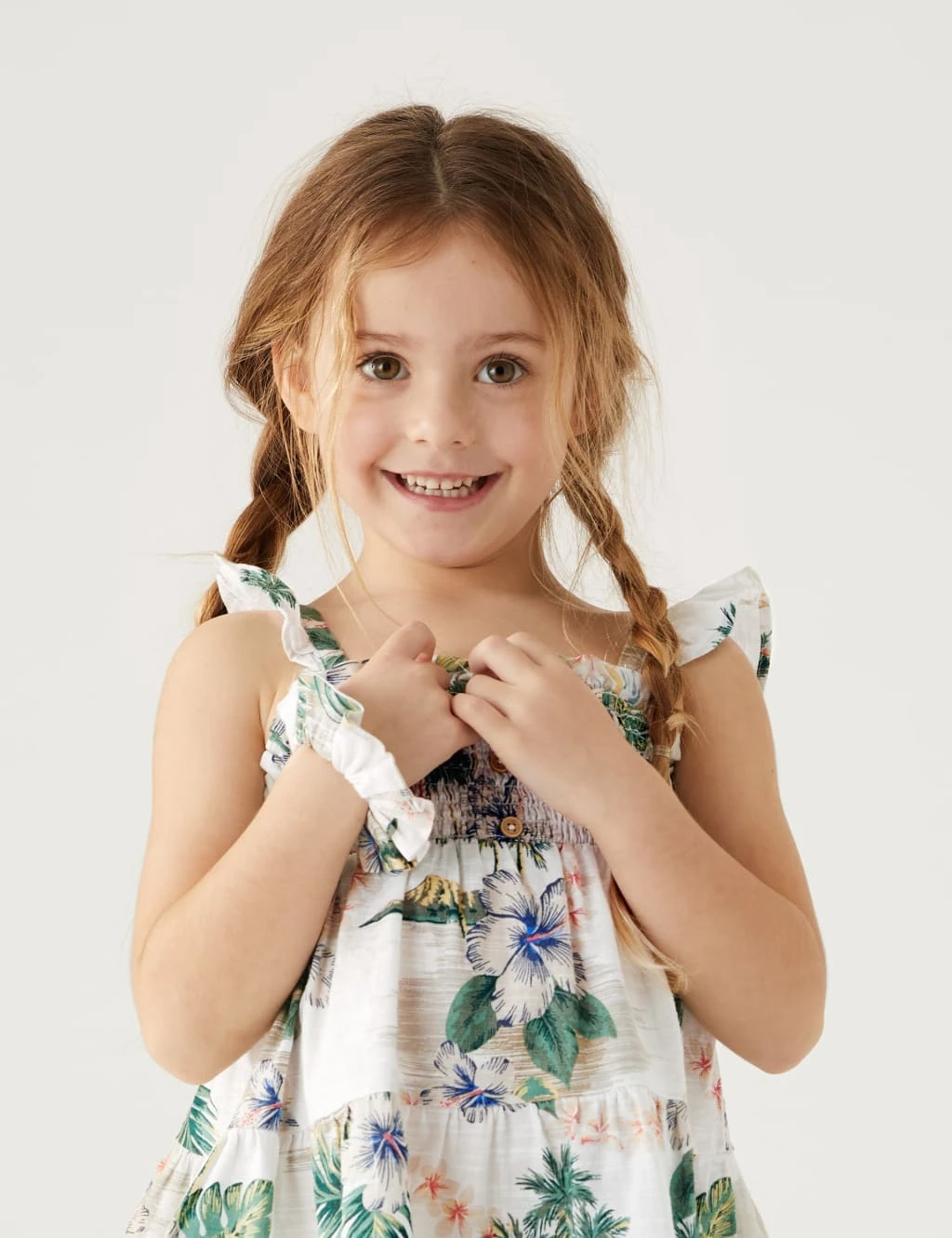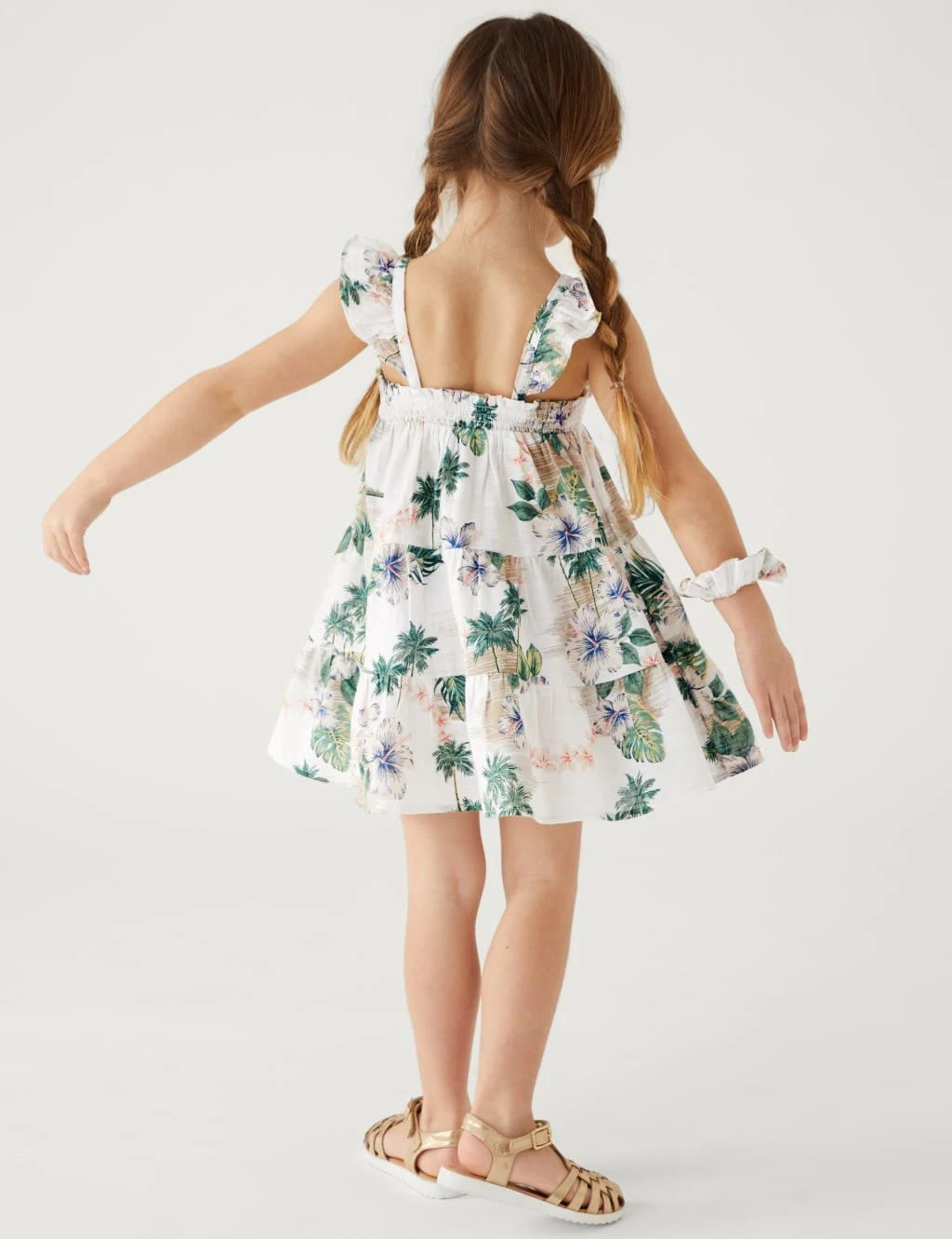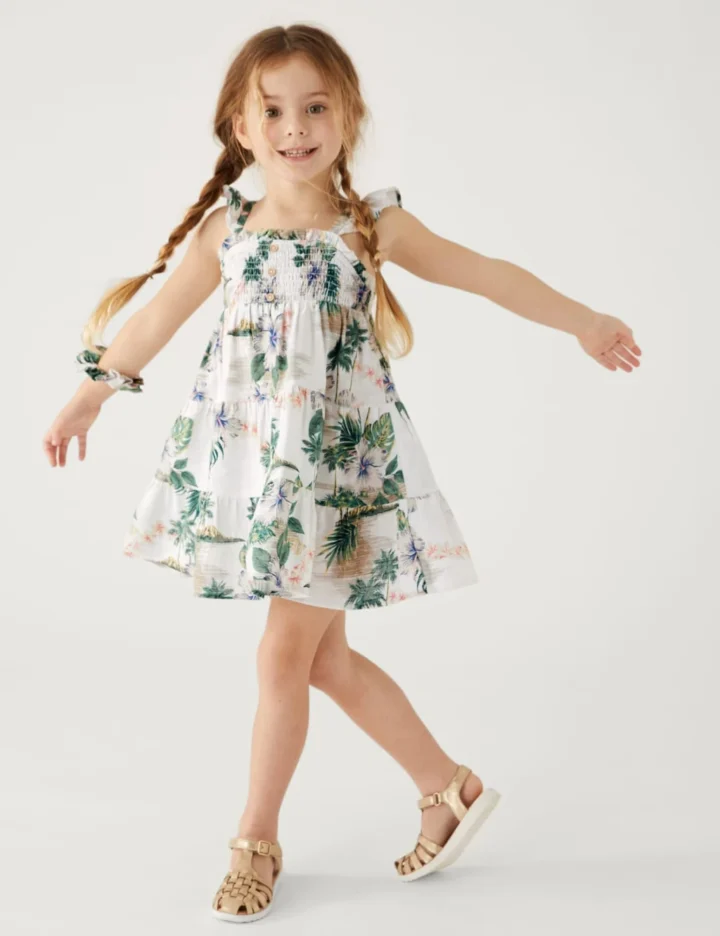 This pure cotton dress comes with a scrunchie for a cute coordinated look. Made to a regular fit, with frills on the straps and a shirred bodice with button detailing. The tiered skirt adds a twirly feel. You can buy a shirt in the menswear range that features the same Hawaiian print, so they can match with Dad.