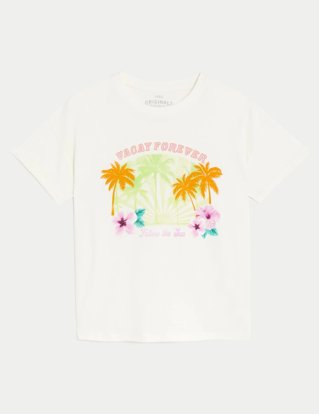 Get kids in the holiday mood with this pure cotton t-shirt. Comfy regular fit. Graphic features palm trees, sunshine and hibiscus flowers. Finished with cheerful slogans reading ‘Vacay forever’ and ‘Follow the sun.’