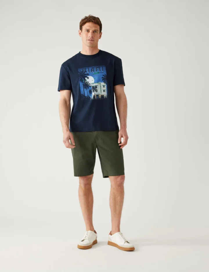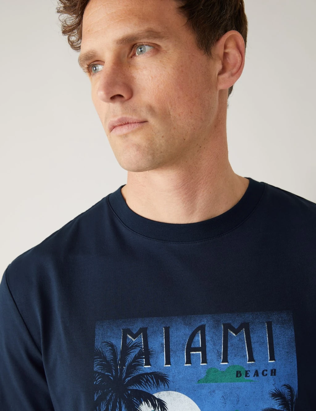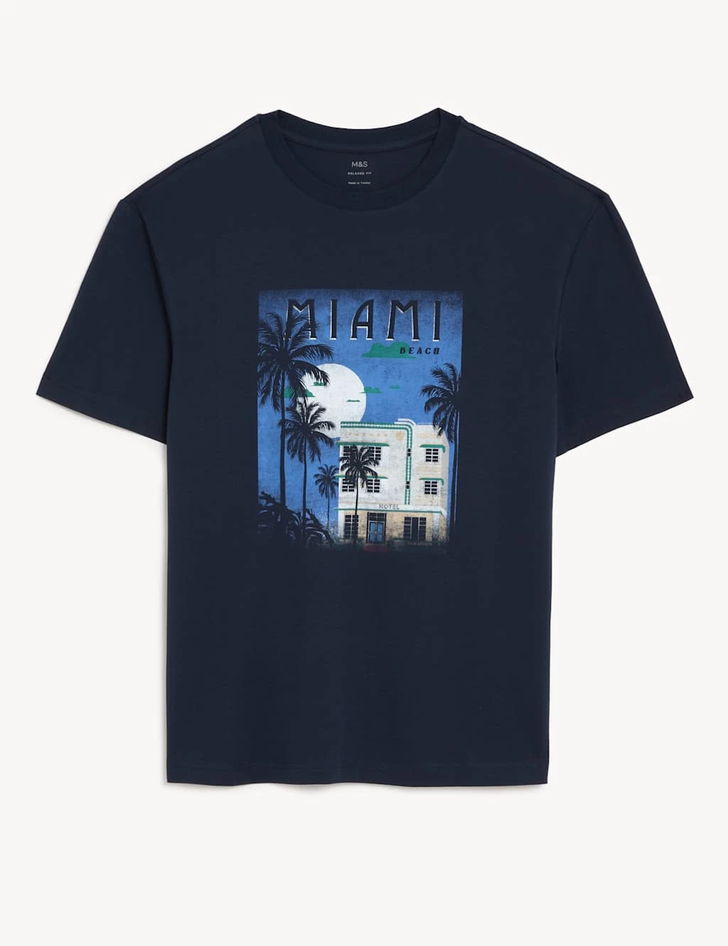 Get into the holiday mood with this cool pure cotton t-shirt. Comfy regular fit. Artwork features an art deco hotel framed by palm trees and the slogan ‘Miami Beach.’