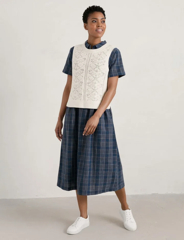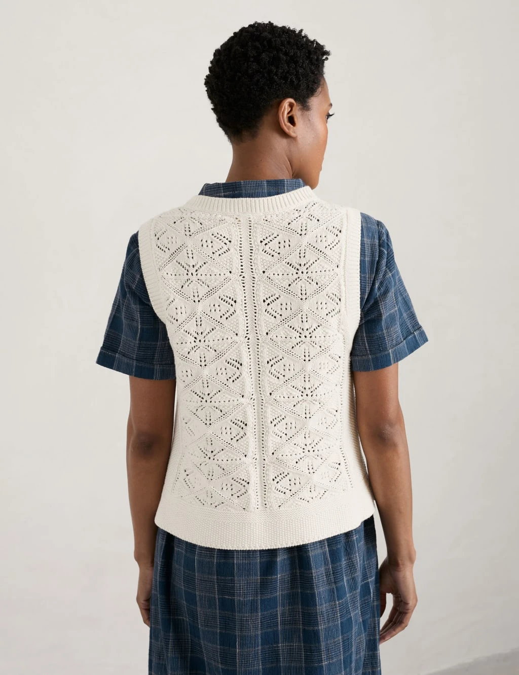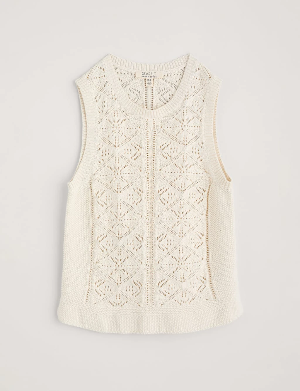 Bring intricate texture to your outfits with this knitted pointelle vest top by Seasalt Cornwall. It’s made to a regular fit, with a neat round neckline that makes it perfect for layering or wearing alone. Ribbed trims add subtle structure to the shape, while pure organic cotton gives a soft, airy feel.