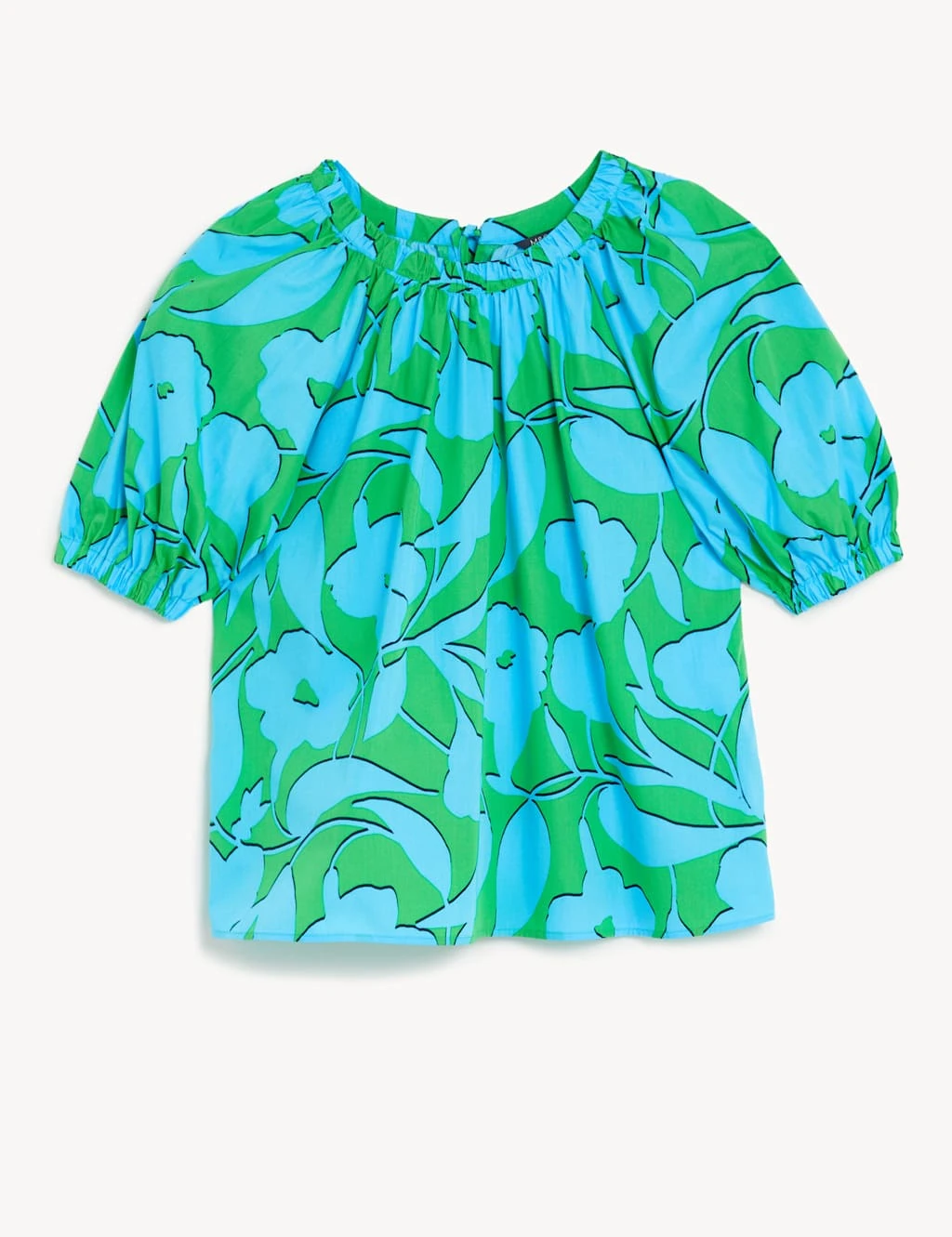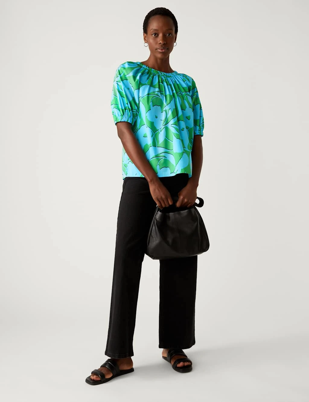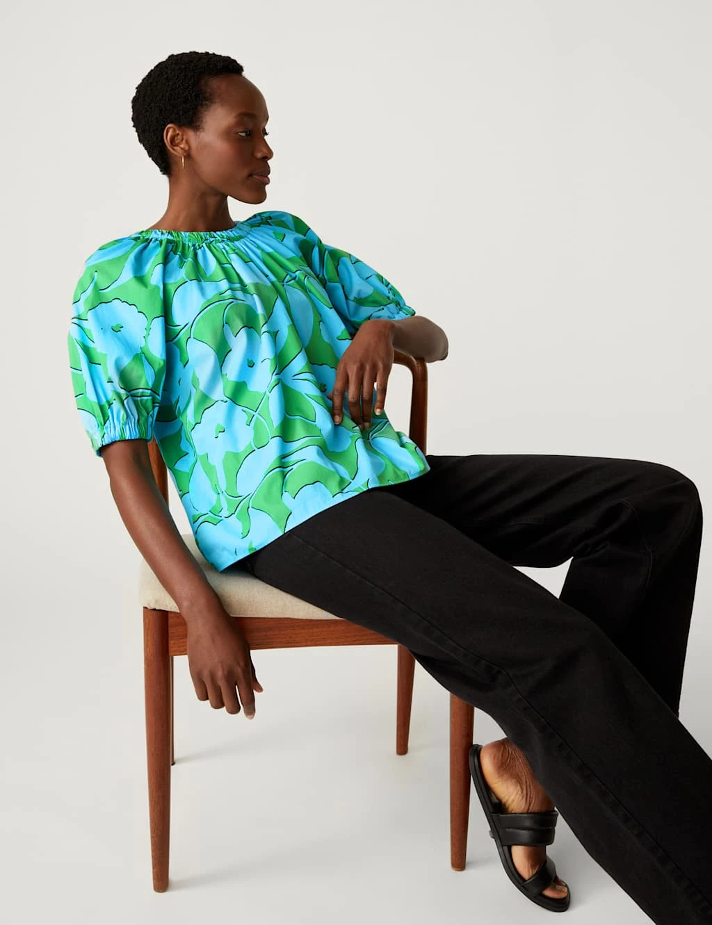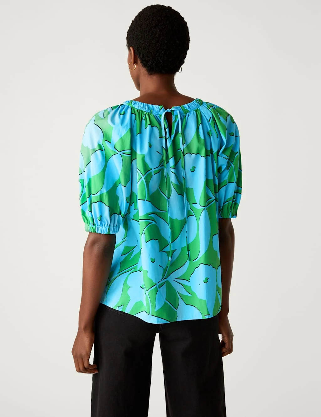 A bold printed design brings a vibrant feel to this pure cotton blouse. Cut in a regular fit, with a neat tie fastening at the back. Gathered detailing at the neck and short blouson sleeves adds volume for a striking finish.