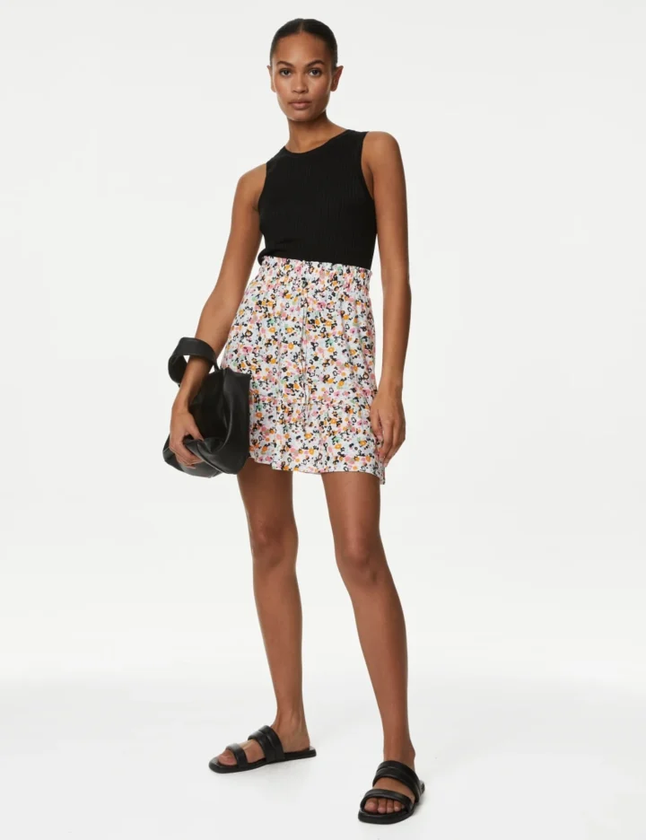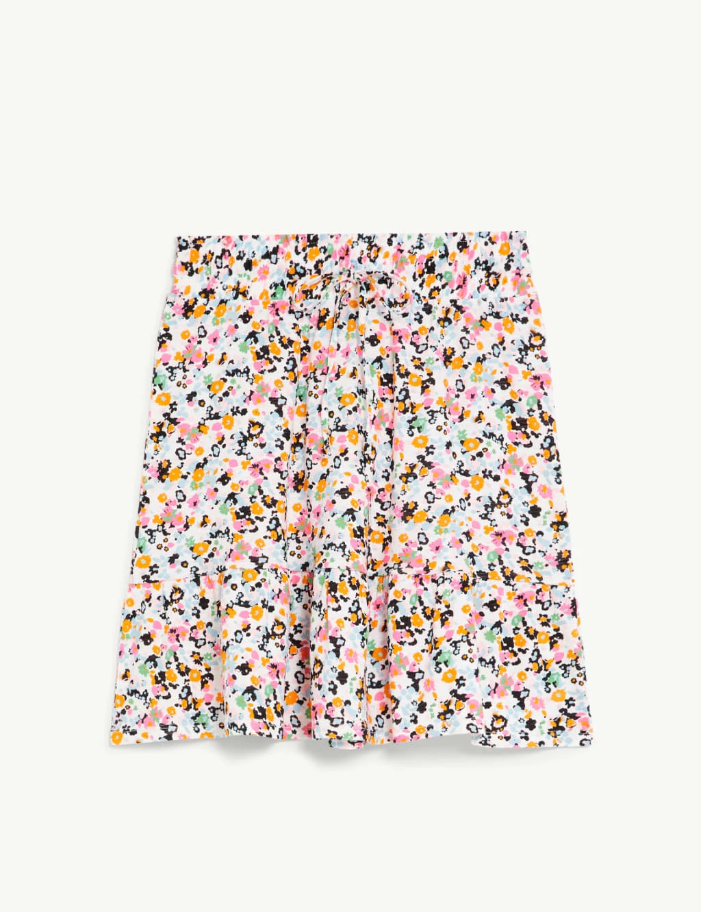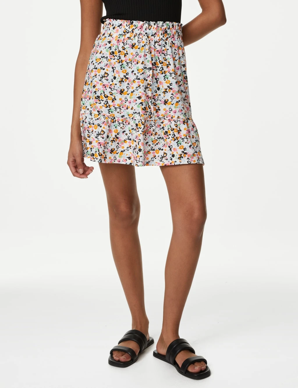 A playful print and soft pure cotton jersey make this mini skirt ideal for warm weather dressing. This effortless piece has drawstring ties at the stretchy elasticated waist for comfortable wear. It’s finished with a stylish gathered tier on the hem.
