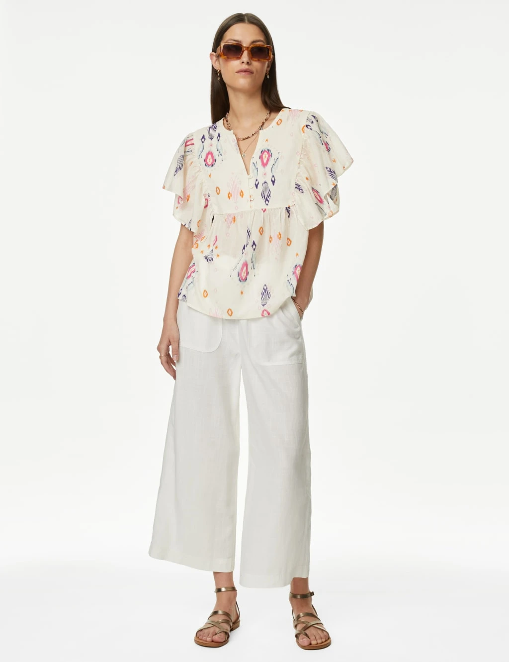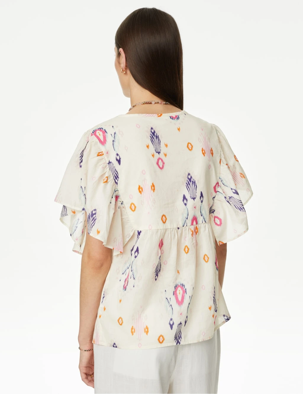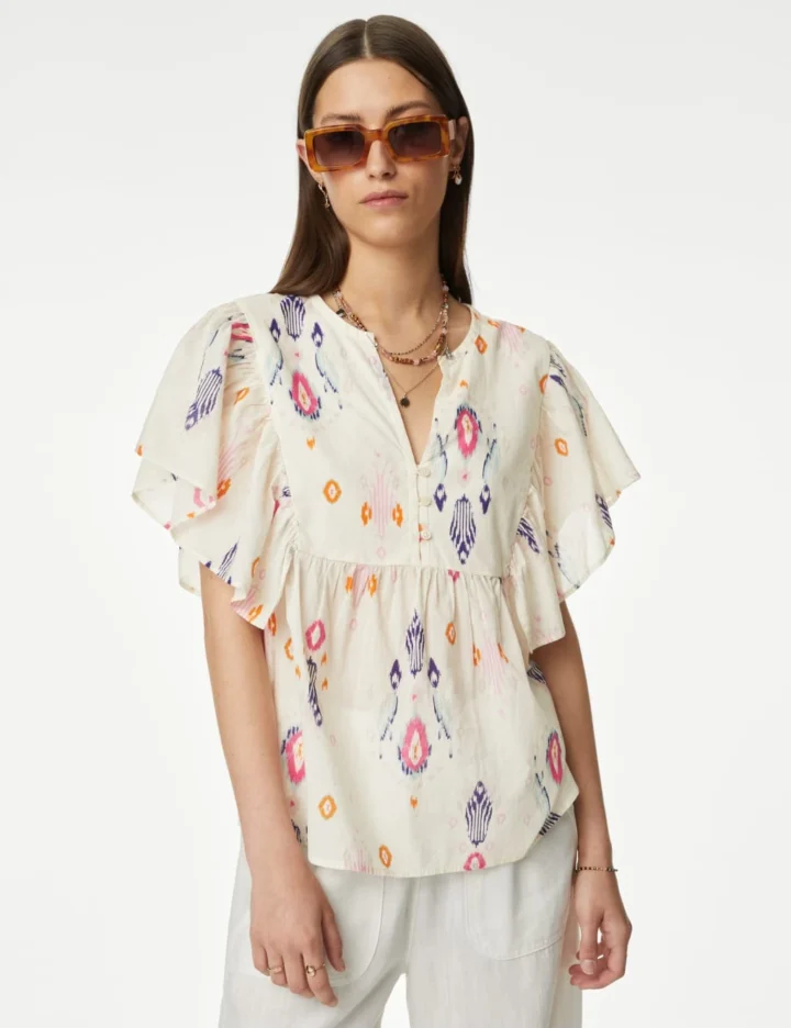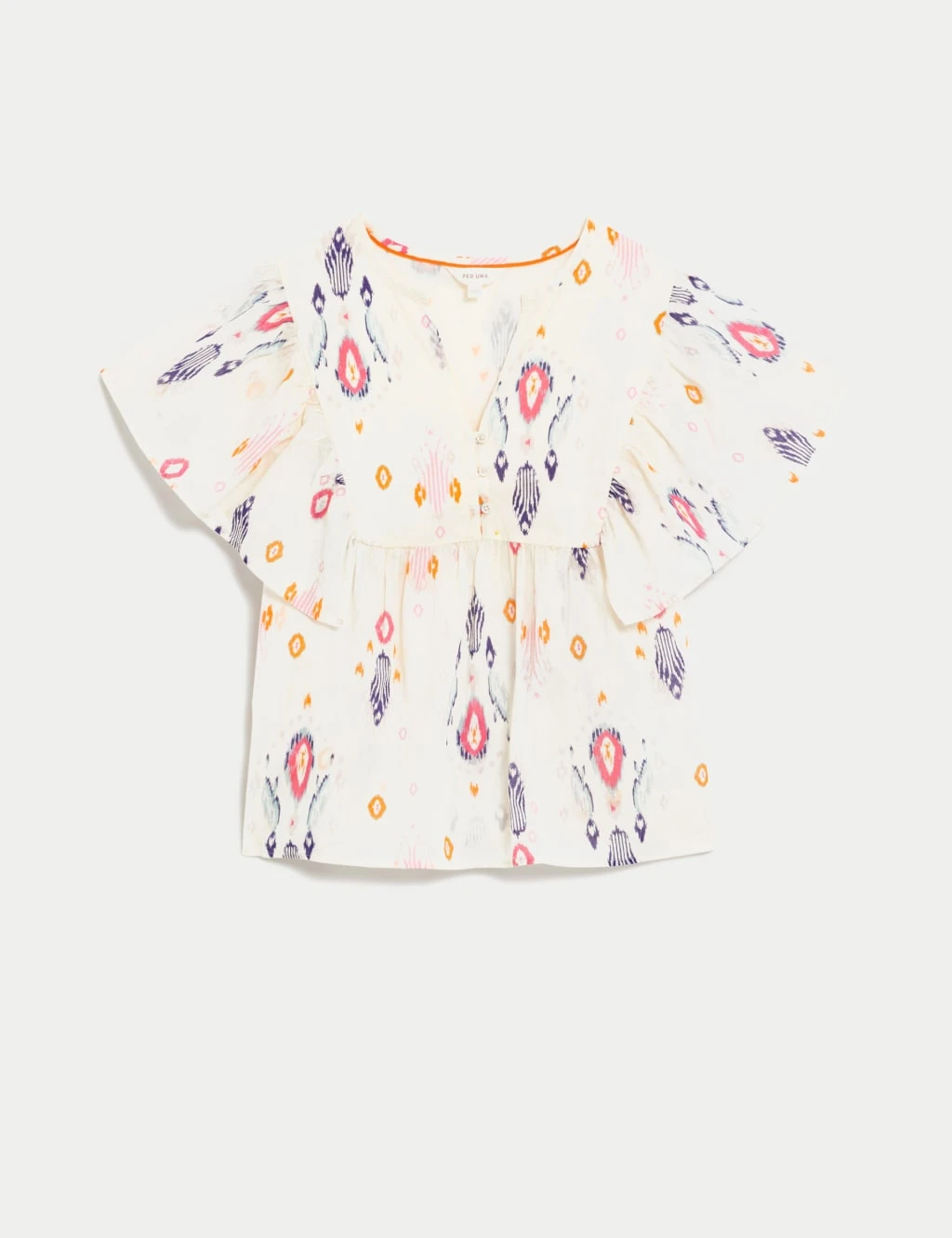 Introduce fresh prints to your wardrobe with this colourful pure cotton blouse from our Per Una range. It’s designed in an easy regular fit, with short ruffled sleeves that add floaty movement to the piece. It’s complete with a flattering notch neckline and delicate buttons through the front.