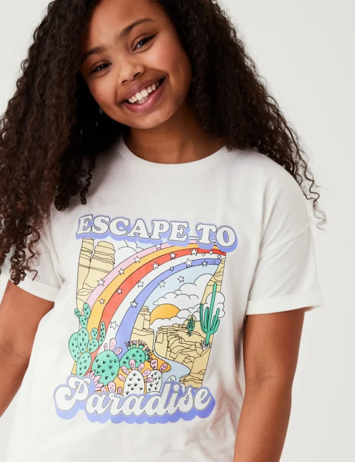 This colourful pure cotton t-shirt is perfect for holiday adventures and outings at home. Cut to a comfy regular fit. The fun print features cactus plants at the end of a star-studded rainbow and the irresistible invitation ‘Escape to Paradise.’