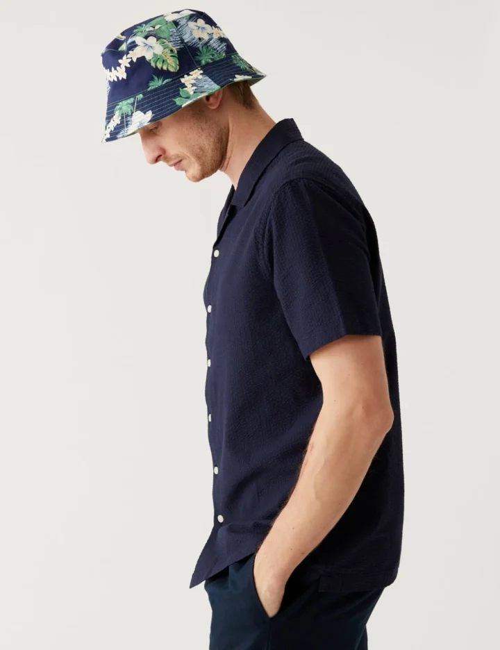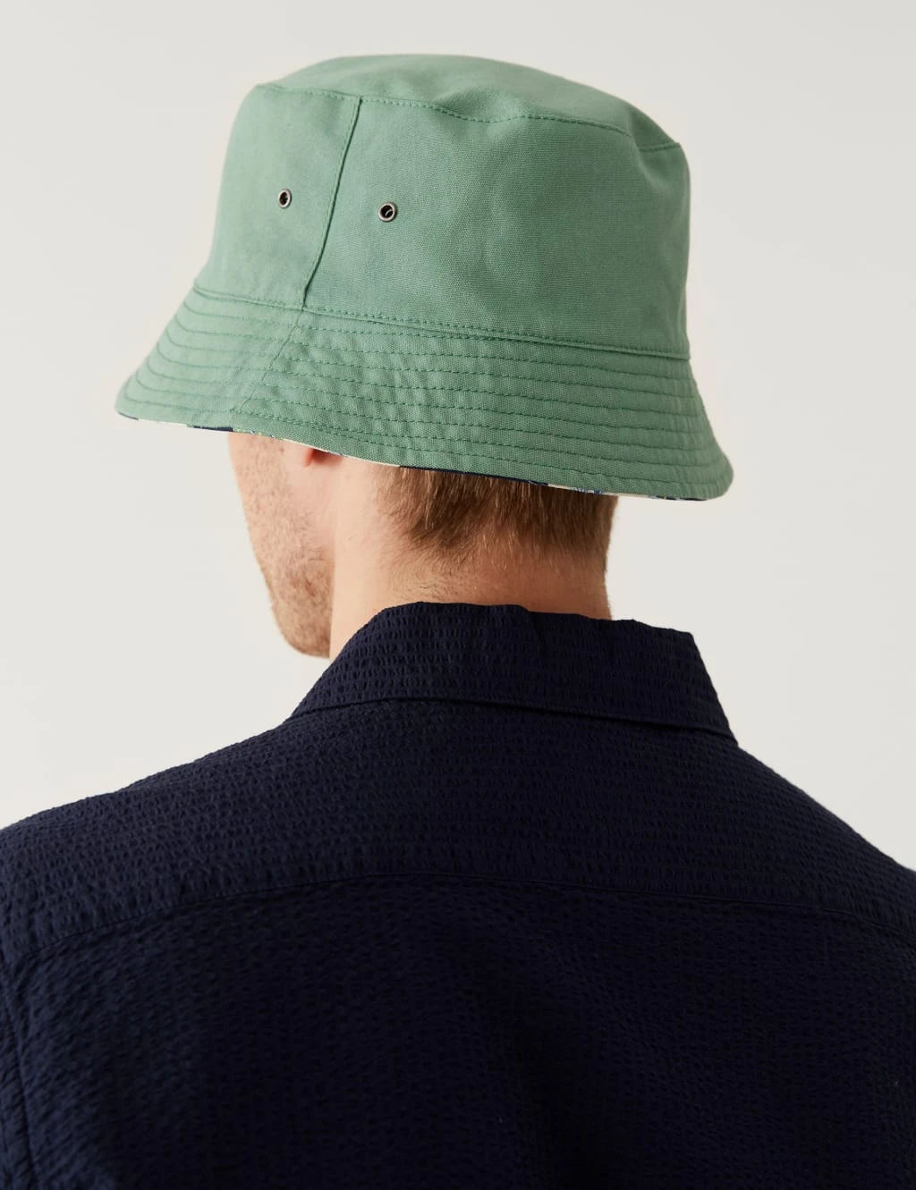 Give your sunny day outfits an eye-catching finish with this pure cotton bucket hat. Reversible design features one plain side and one with a tropical-inspired print. Sun Smart fabric helps provide protection from harmful UV rays.