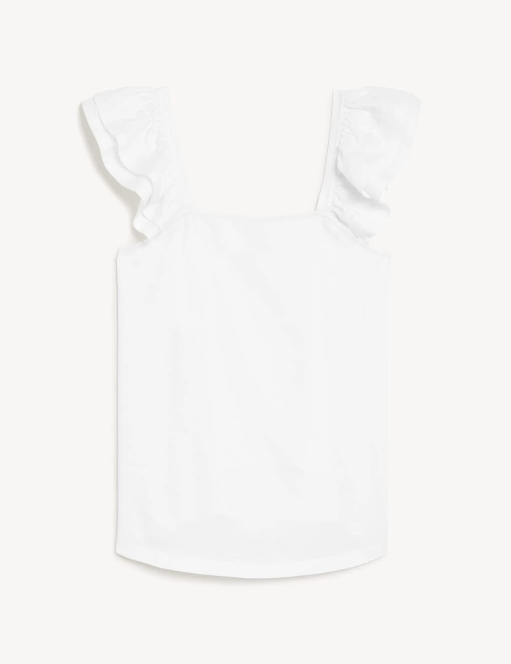 Make a stylish statement on summer days in this pure cotton vest. Cut in a comfortable regular fit with a square neckline. Pretty ruffled straps and embroidered detailing add a delicate finish.