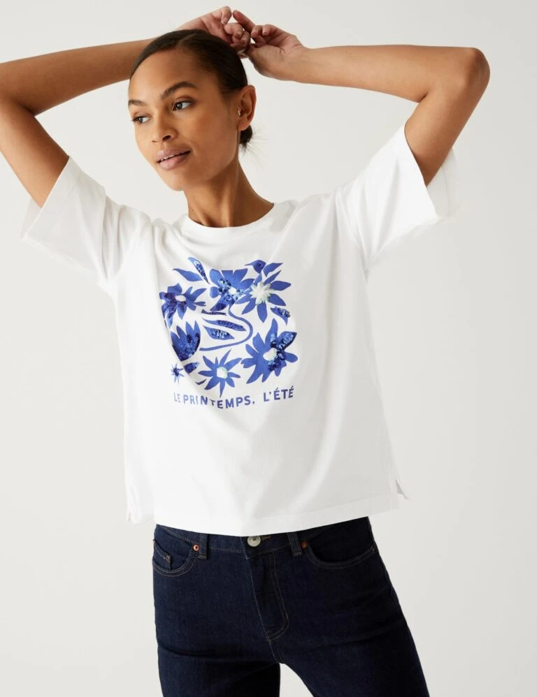 Add a touch of sparkle to your ensemble with this pure cotton t-shirt. It’s cut in an easy regular fit, with a crew neck. The striking floral print is embellished with sequins for a shimmering finish.