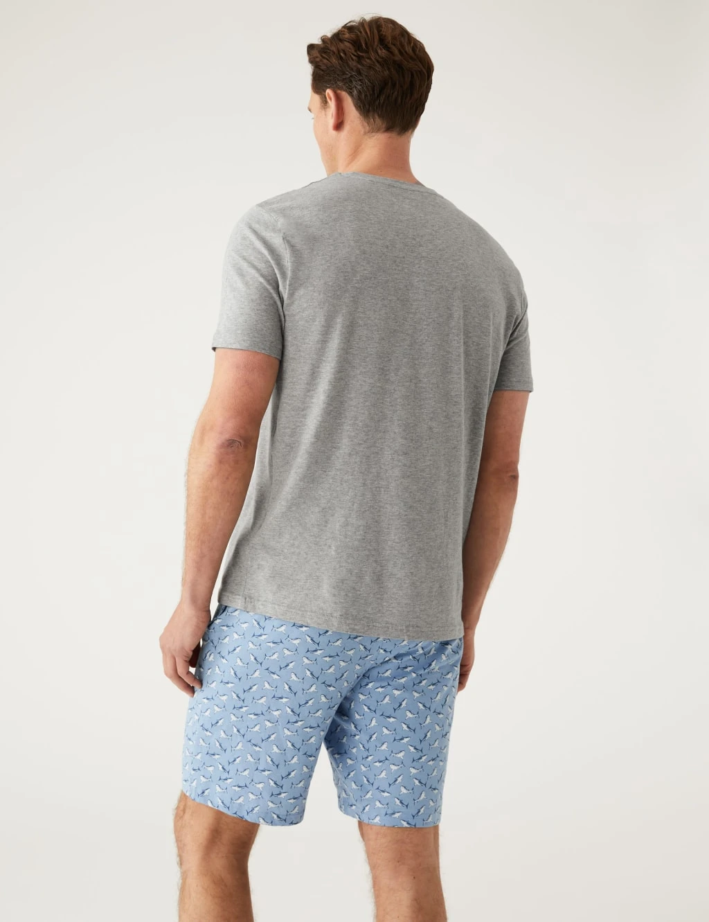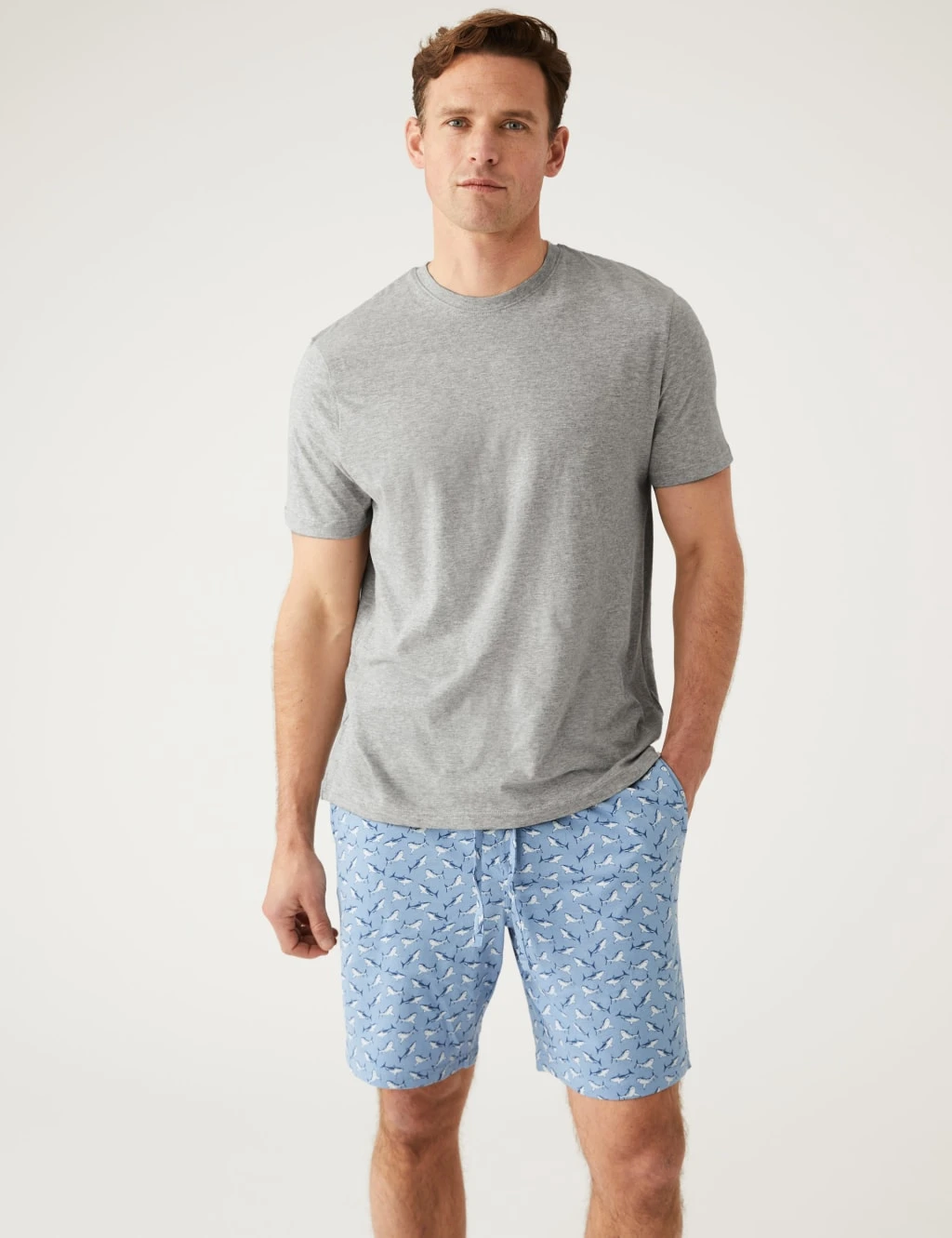 Relax, unwind and sleep the whole night through in these pure cotton short pyjamas. Regular fit. The set includes a short-sleeved t-shirt and shark-printed shorts with an elasticated drawstring waistband for comfort.