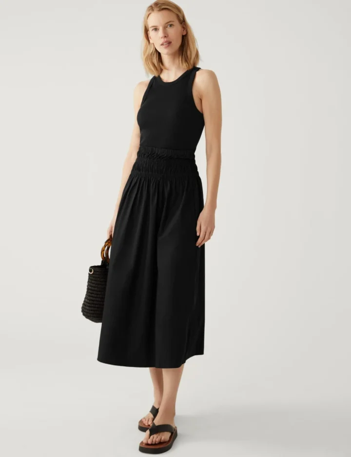 Pure cotton poplin gives this stylish skirt a crisp, smooth feel. It’s cut in a flattering skater shape, with elasticated shirring at the waistline for stretchy comfort and added texture. The hemline sits at a flowing midaxi length.