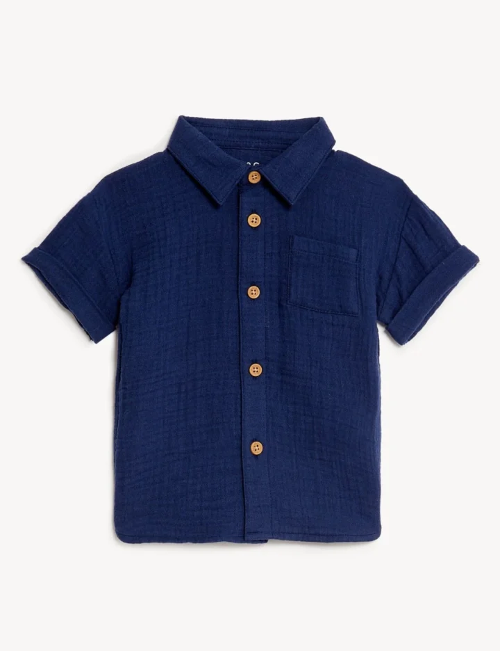 Keep them cool on warmer days in this lightweight pure cotton shirt. Features breezy short sleeves, a smart collared neckline and contrast buttons. The double-cloth fabric has a lightly crinkled appearance for a relaxed look. A patch pocket on the chest adds a neat finishing touch.