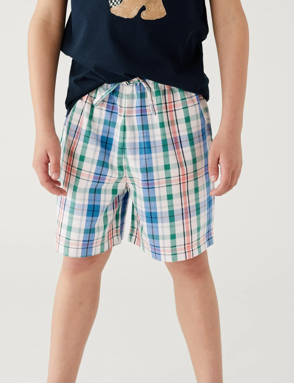These pure cotton pyjamas will make a cute addition to their sleepwear collection. Made in a regular fit for comfort. Includes a pair of checked shorts with an elasticated waist and a drawstring fastening, as well as a short-sleeved t-shirt with a round neck. Complete with a cool graphic of our mascot Spencer Bear for added personality.
