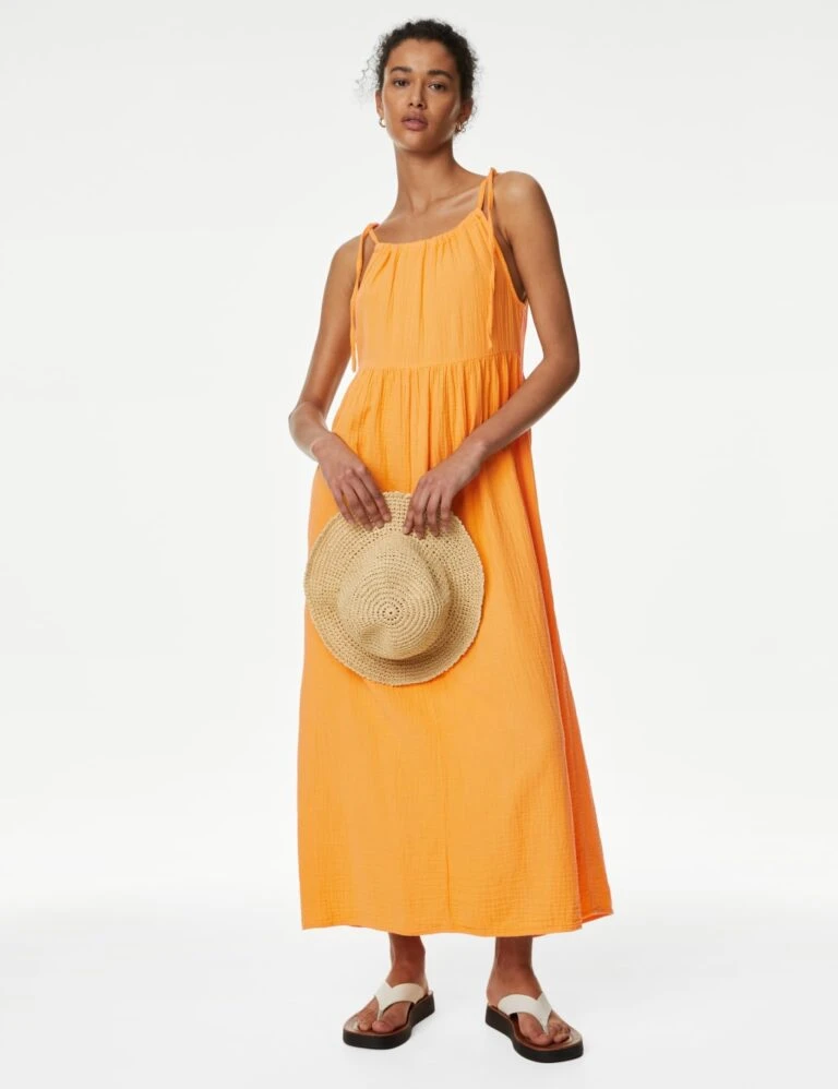 Add this double-cloth, pure cotton beach dress to your holiday wardrobe for easy-breezy style. It’s cut to a regular fit and features a flattering square neck. The design has a drapey midaxi-length hem and fastens at the shoulders with pretty straps that can be tied into a bow.