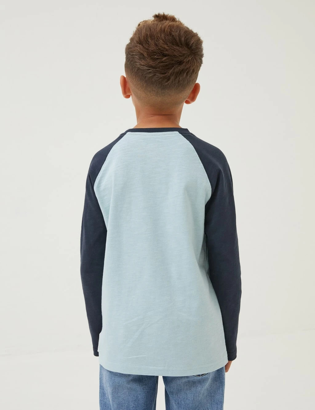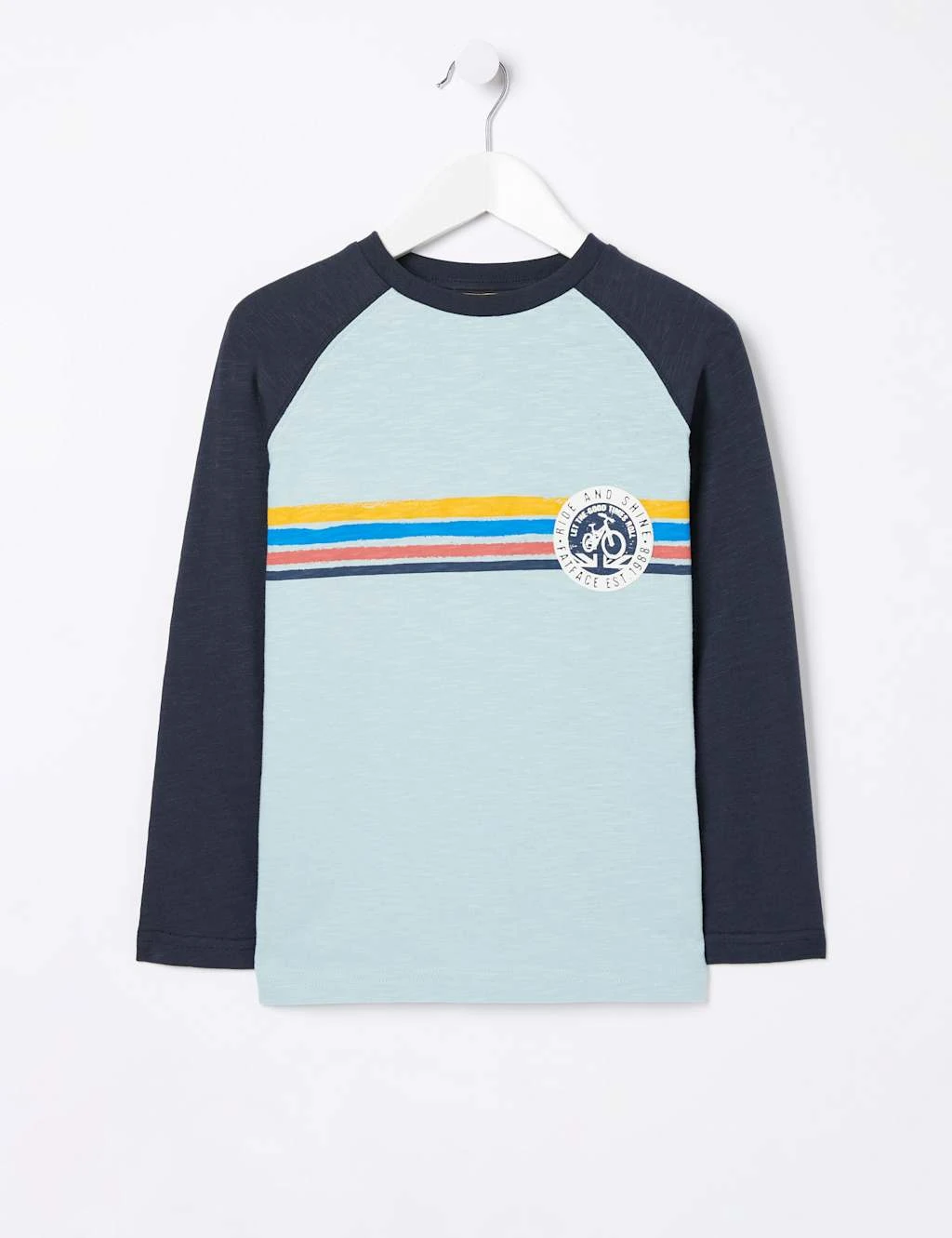 This pure cotton t-shirt from FatFace is ideal for young cyclists. Crafted to a regular fit, it features a comfortable round neck and long sleeves in a contrasting colour. On the chest, a positive ‘Ride and Shine’ slogan circles a bicycle graphic set against a band of colourful stripes.