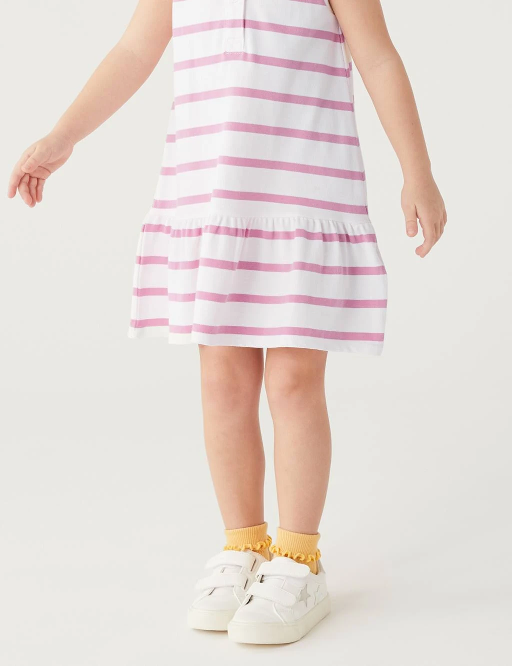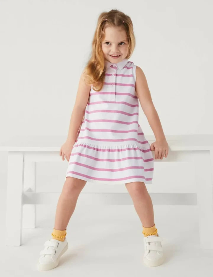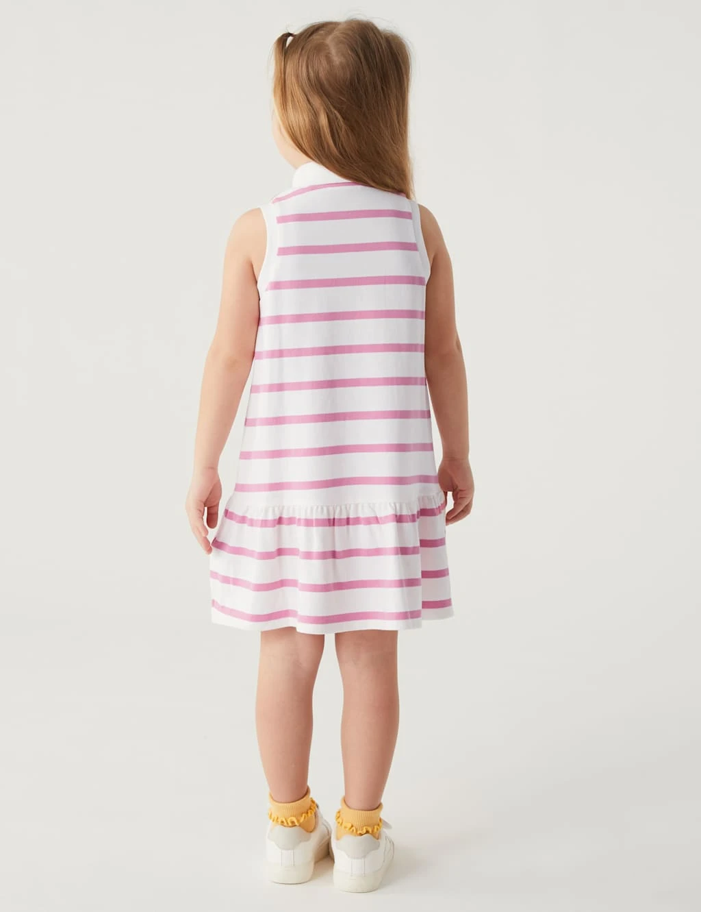 Little ones will look charming in this pure cotton dress. Sleeveless design, made in a regular fit. Polo style with a sporty collared neck and neat button fastening. Finished with an all-over striped pattern and a pretty frill hem.