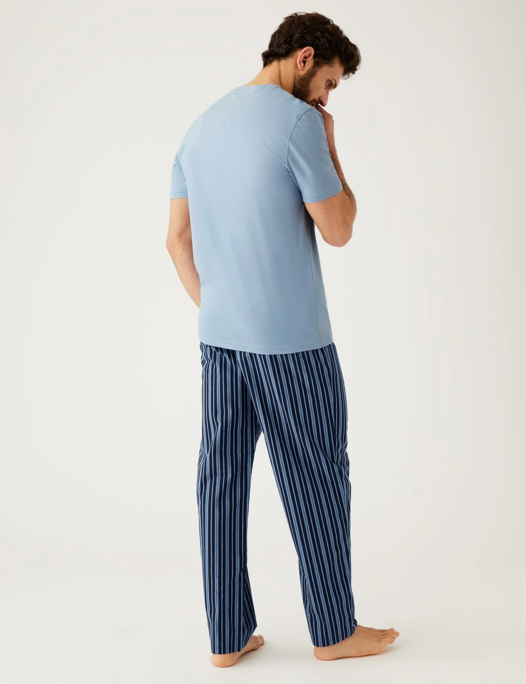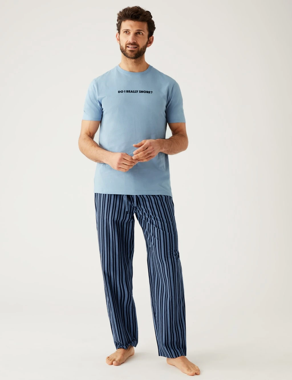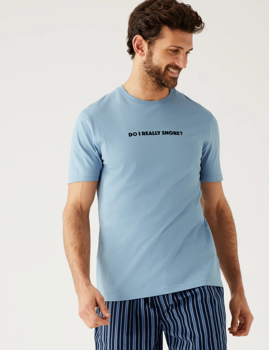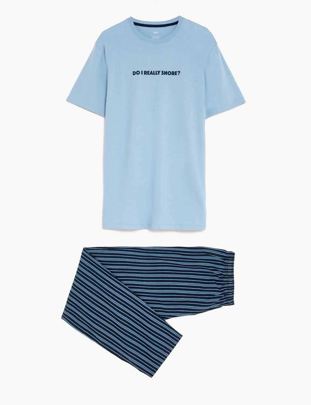 These ‘Do I Really Snore?’ slogan pyjamas ask the important question about bedtime. Made from pure cotton in a comfy regular fit. Set includes a short-sleeved top and striped bottoms with a drawstring waist, mock fly and side pockets.