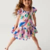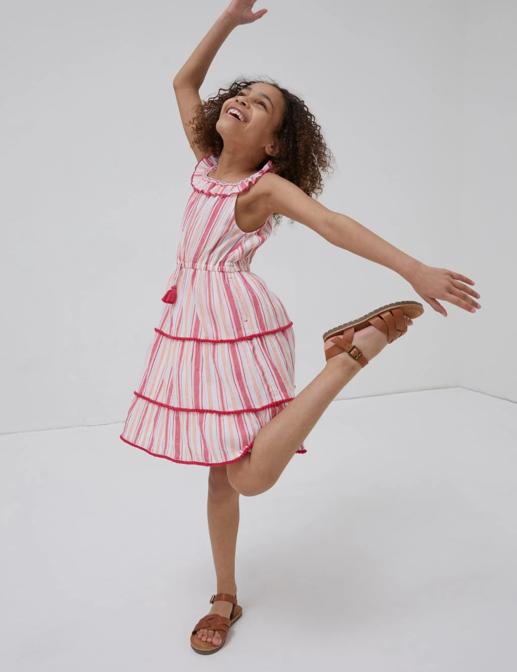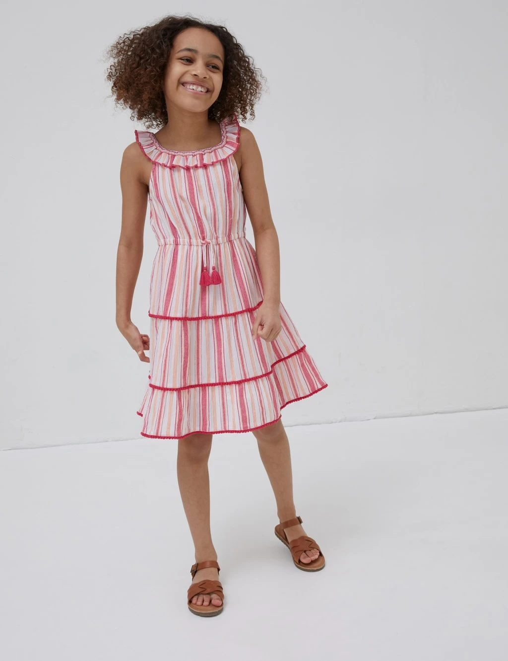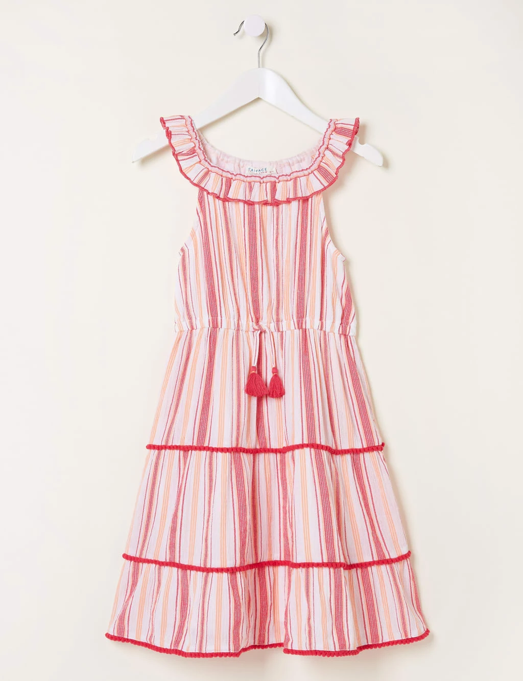 Made from pure cotton, this bright striped dress from FatFace is perfect for warm-weather occasions. It’s cut in an easy regular fit, with a comfortable full lining and a tasseled drawstring at the waist. The round neck features sweet ruffle detailing, while the breezy tiered skirt is finished with pretty pom-pom trims.