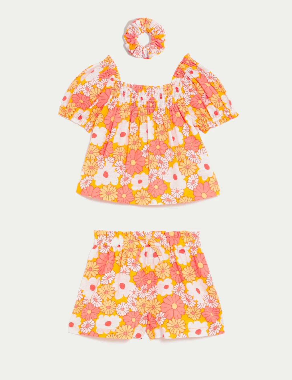 Kit kids out in full colour with this pure cotton floral outfit. Coordinating three-piece set, made to a comfy regular fit. The square-necked top has pretty puff sleeves and a stretchy shirred panel at the chest. The shorts feature an elasticated tie waist for comfort. A matching scrunchie completes the look.