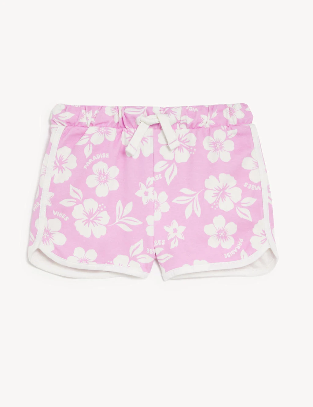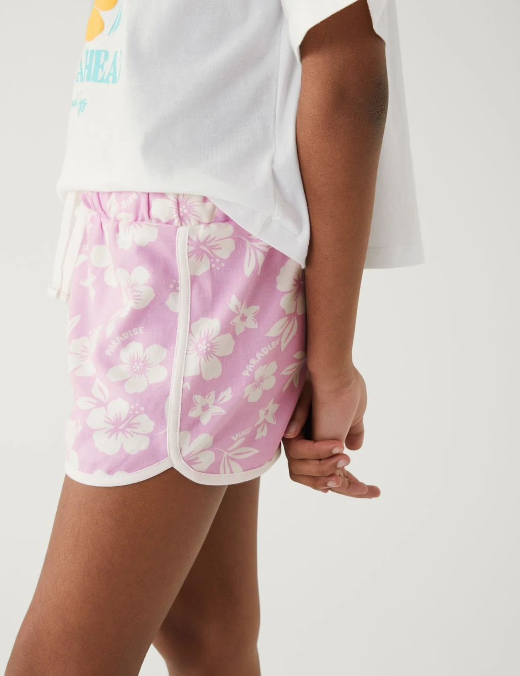 Get them in the holiday mood with these pure cotton shorts. Classic runner style, with a comfy regular fit and a drawstring waist. The slogans within the tropical print add to the laid-back feel.
