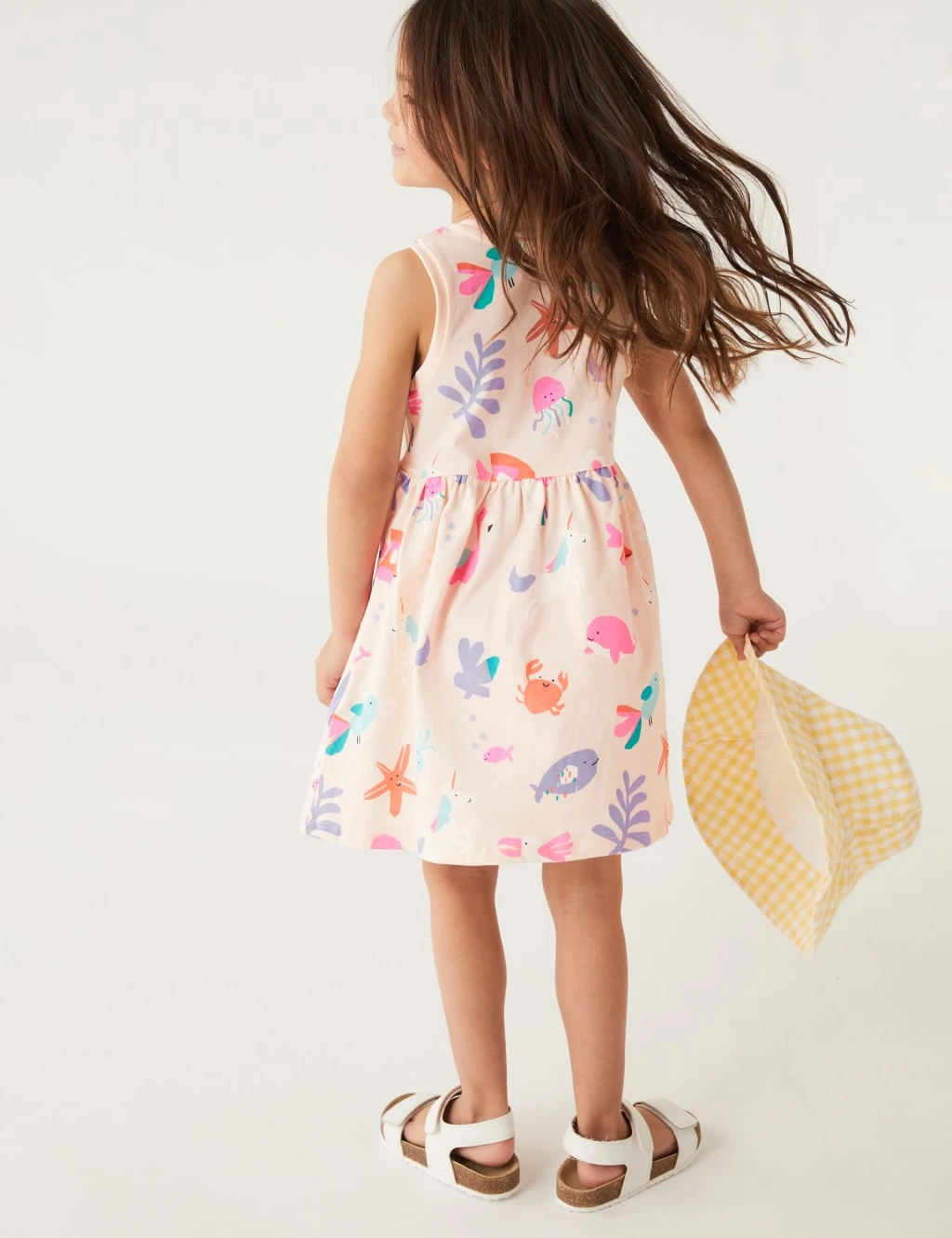 This pure cotton dress features a playful print of unicorns, birds and sea creatures. Comfy regular fit, with an easy sleeveless bodice. Gathering at the waist adds a sense of movement to the skirt.