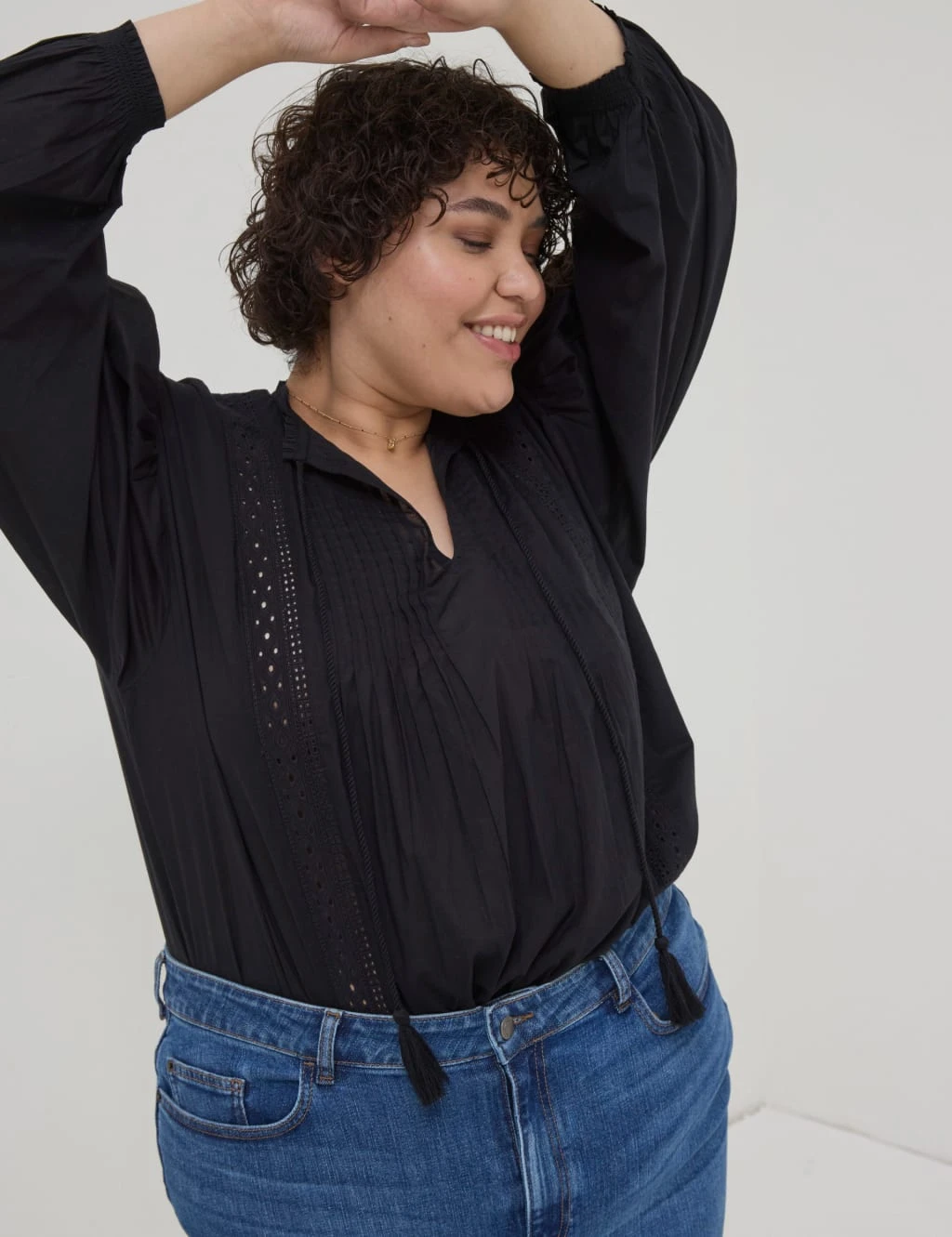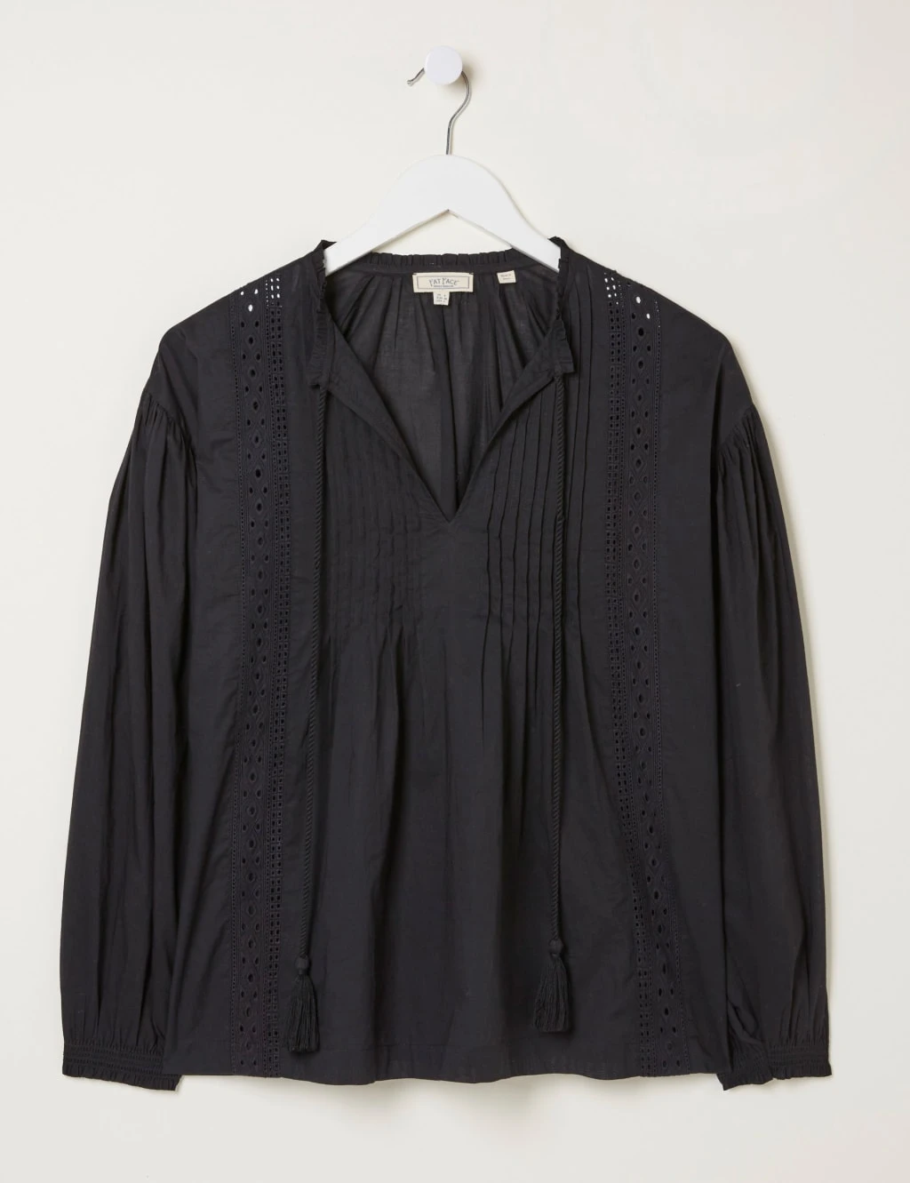 Add a dash of romance to your ensemble with this pure cotton blouse by FatFace. It’s designed in a roomy regular fit for comfort and has long gathered sleeves with shirred cuffs to bring volume to the silhouette. Lace inserts and pintucks on the front lend delicate detail, while the v-neckline is complete with tasselled ties for a touch of boho charm.