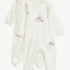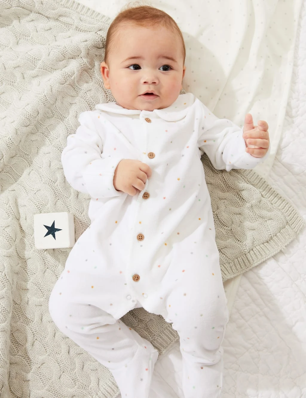 With its all-over star print, this pure cotton velour sleepsuit is a must-have for baby’s new wardrobe. Features long sleeves for warmth and added elastic on the back for a comfortable fit. Crafted with Babysafe toes and anti-slip technology for safety along with integral mitts to prevent scratching up to 3 to 6 months. Complete with wood-effect buttons and a charming collar. We only ever use responsibly sourced cotton for our clothes.