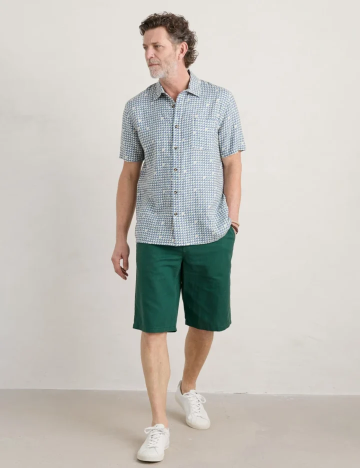 This pure linen geometric print shirt from Seasalt Cornwall is perfect for days out in the sun. It’s made to a regular fit, with a classic collar and short sleeves. Mock-horn button fastenings and a handy chest pocket complete the design.