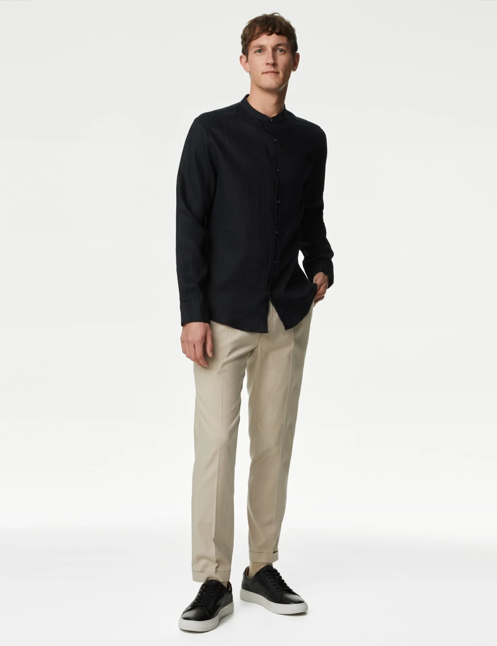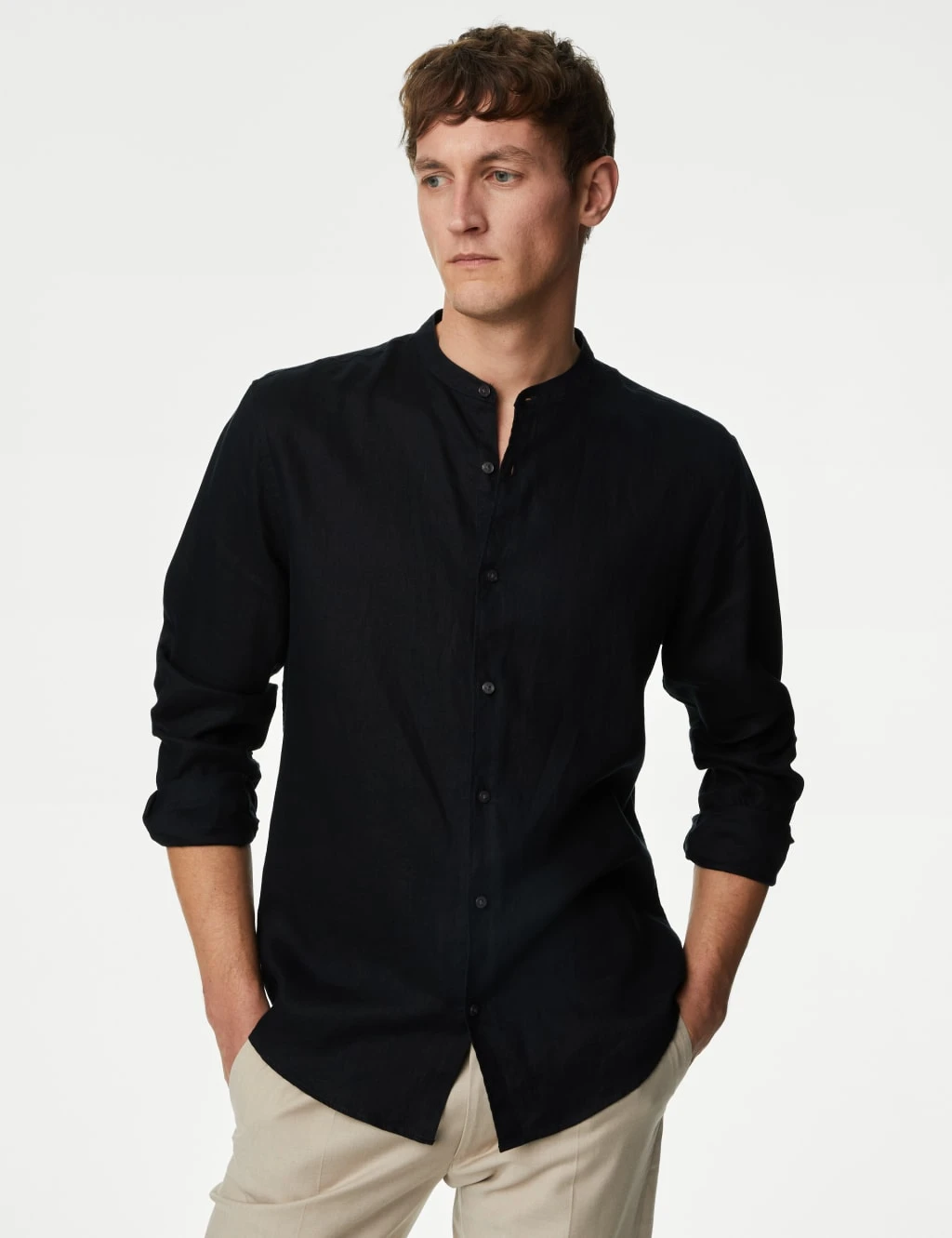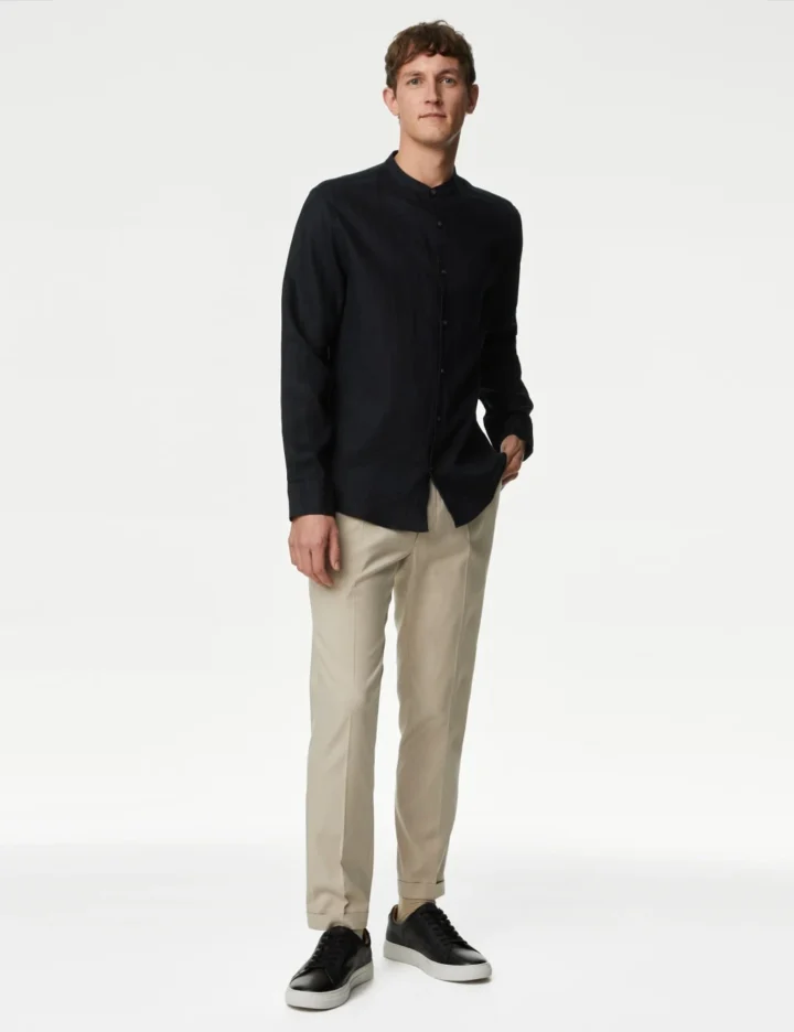 Elevate your smart-casual wardrobe with this crisp shirt, crafted from breathable pure linen. It’s cut to a comfortable regular fit and features an on-trend grandad collar. An easy-to-iron finish means all it needs is a quick press.
