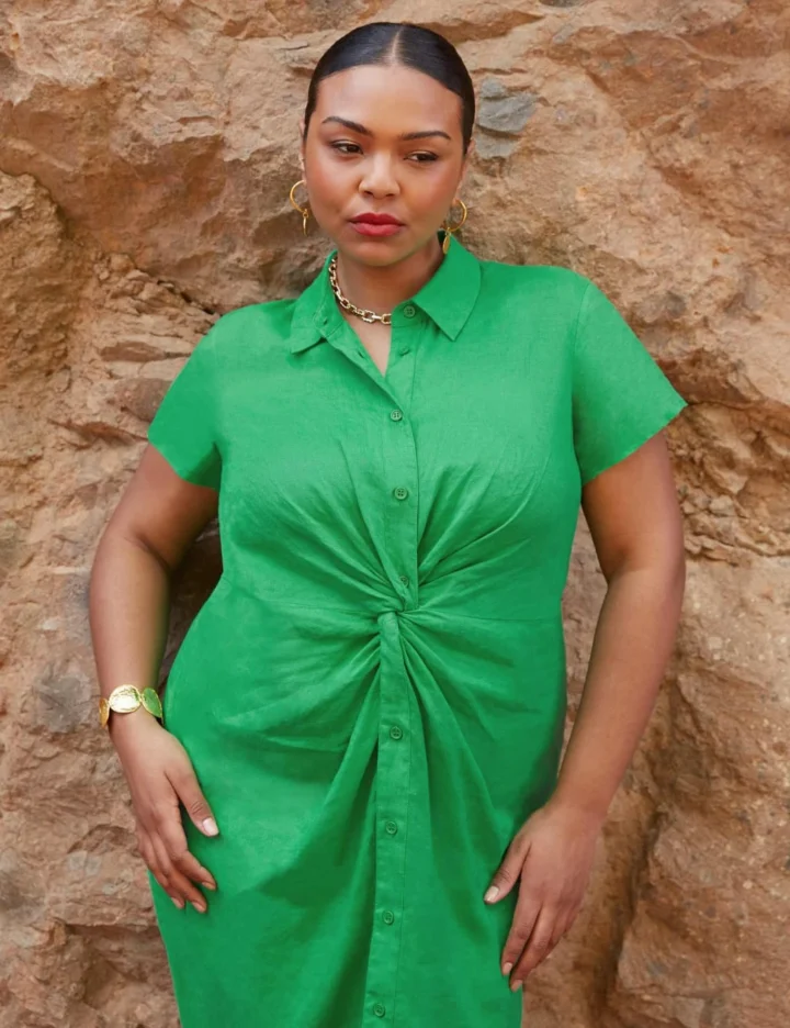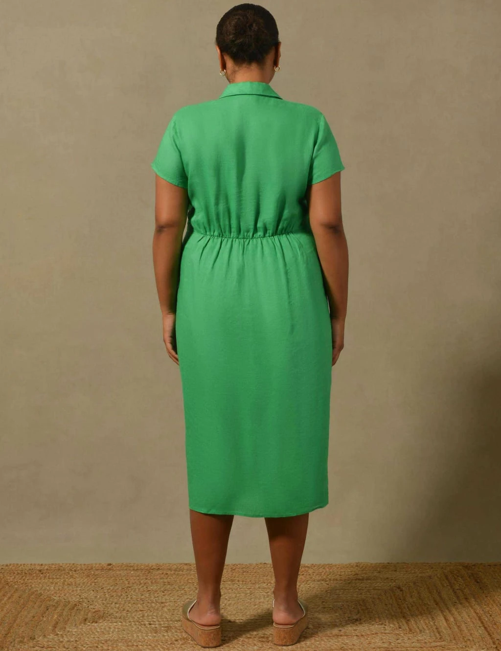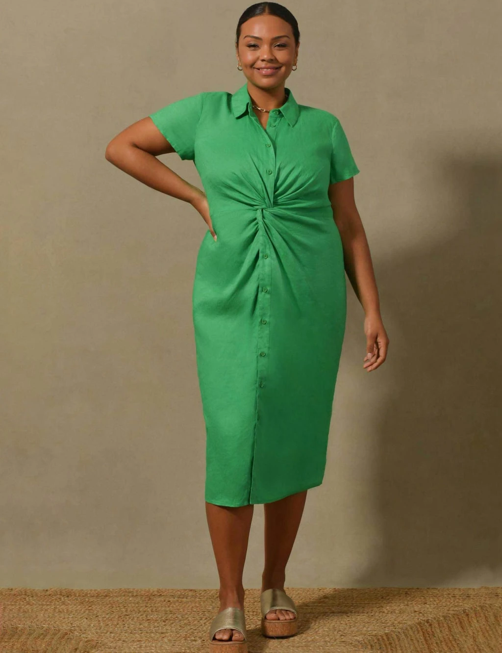 This pure linen shirt dress from Live Unlimited London has a twist-front detail that’s designed to flatter. It’s cut in a relaxed fit for throw-on-and-go style, with short sleeves, a smart collar and a matching button-through placket. The midi-length skirt makes this contemporary piece a versatile choice.