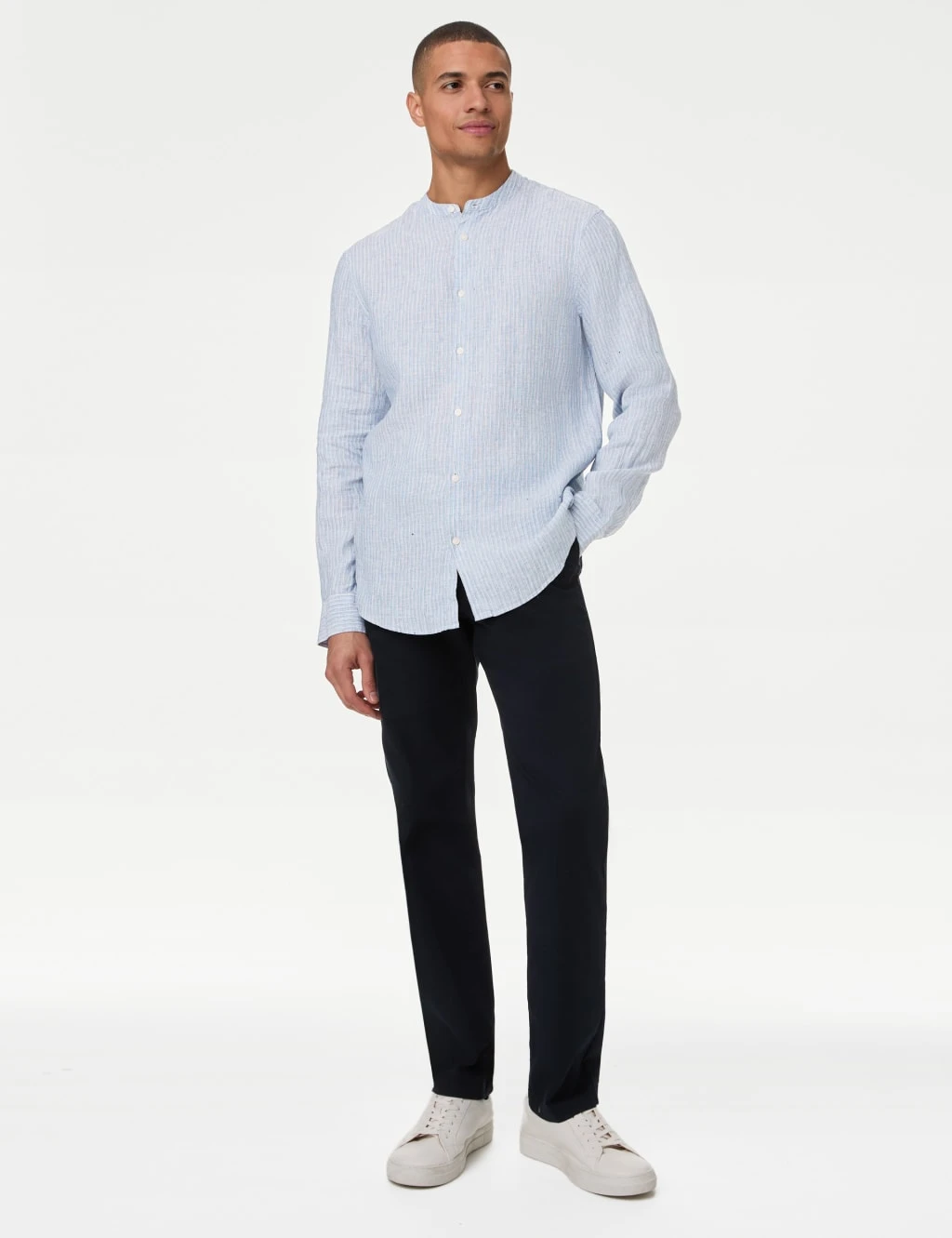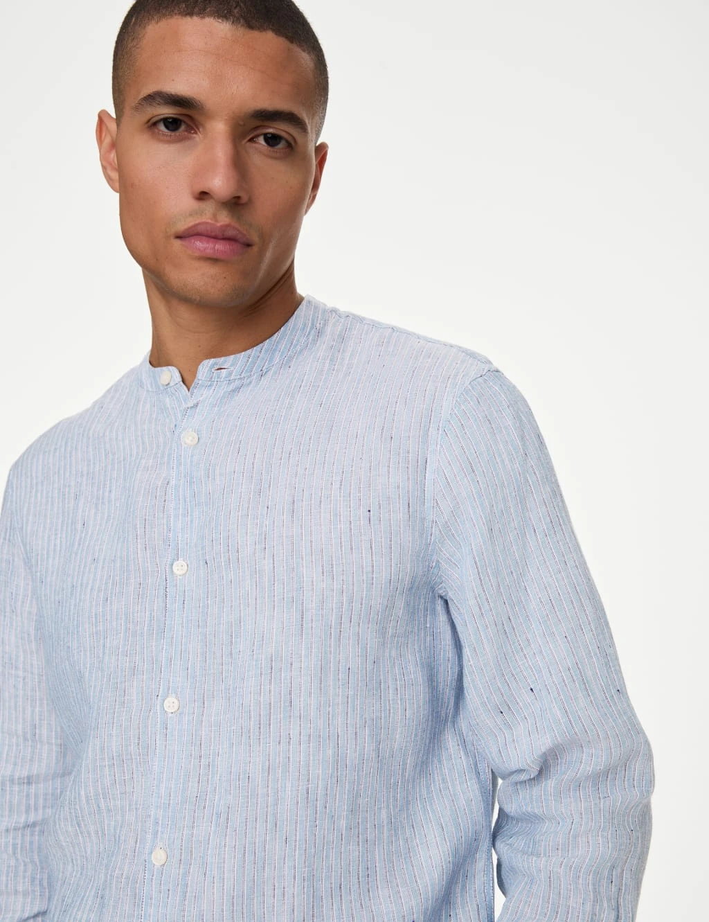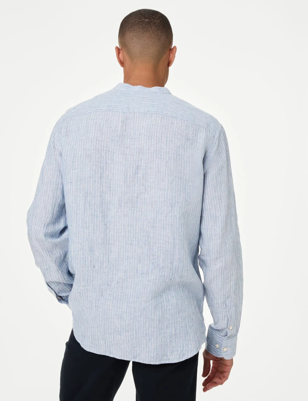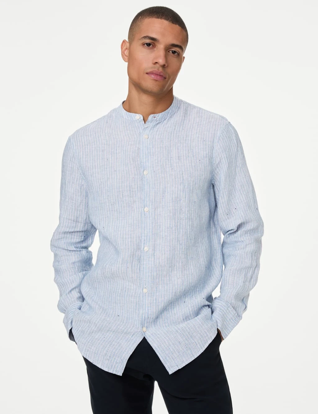 Subtle stripes and a grandad collar give this shirt a laid-back aesthetic. Regular fit, with long sleeves. The pure linen fabric and moisture-wicking properties keep you looking and feeling fresh all day. Easy-to-iron finish means it only needs a quick press.