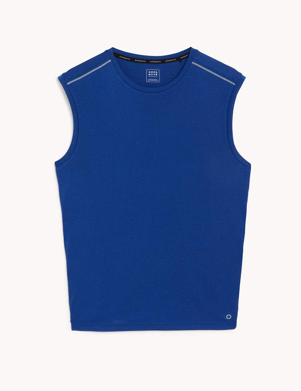 Work out in comfort with this training top from the Goodmove collection. Sleeveless style, featuring a crew neckline. The breathable fabric material draws moisture away from the skin and dries quickly so you feel cool and fresh during workouts. A reflective trim at the hem completes the design.