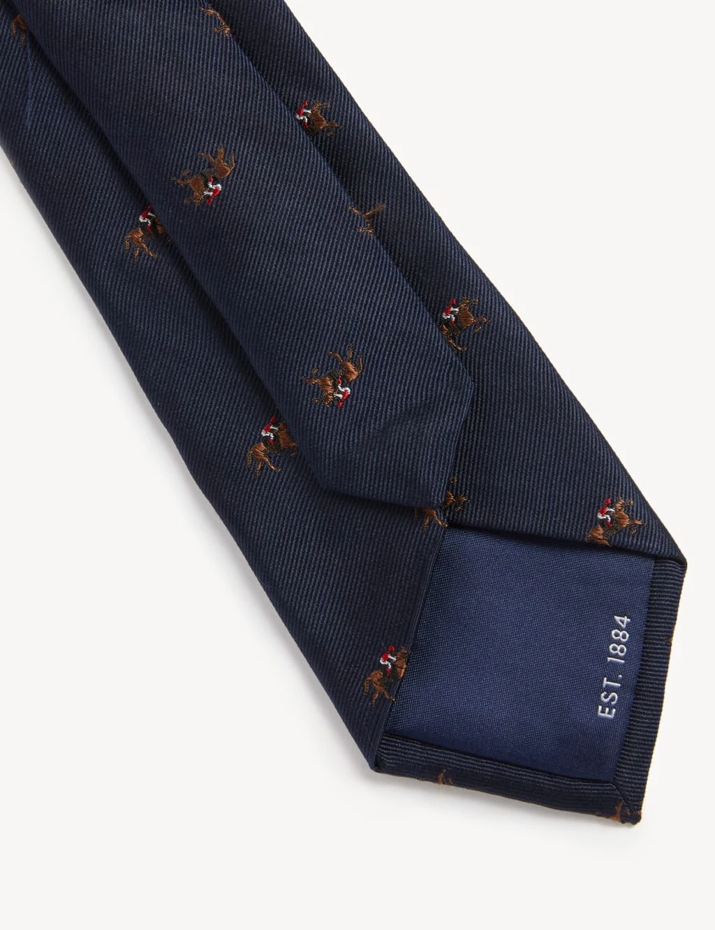 This luxurious silk tie is a playful choice for days at the races and other formal events. The embroidered design shows a repeating pattern of race horses being ridden to victory.