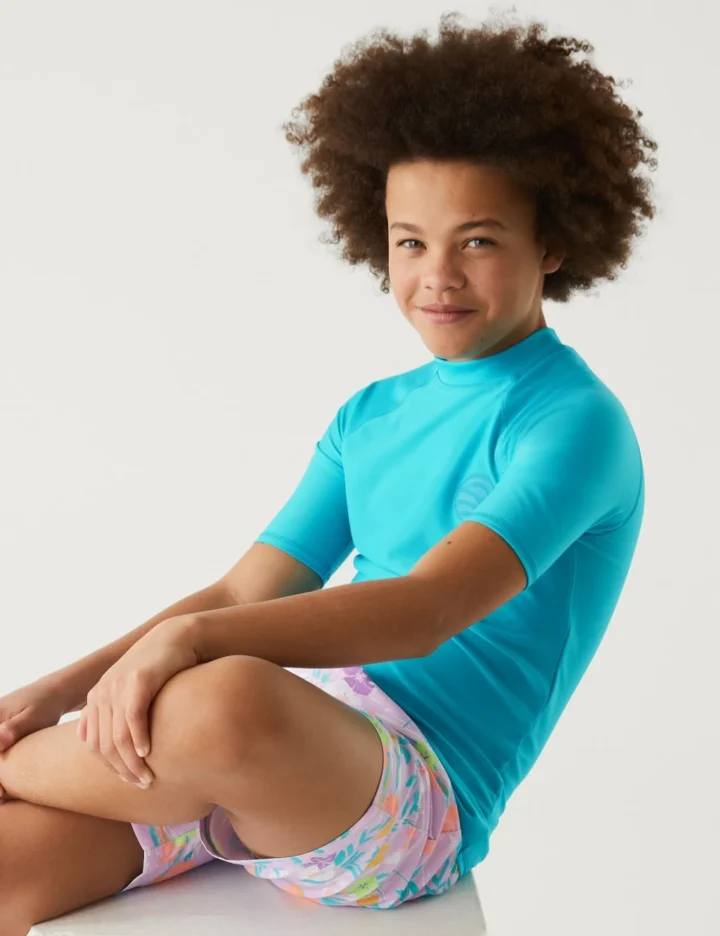 Keep them comfy on water-filled sunny days with this rash vest. Cut to a regular fit with short sleeves and a subtle 3D motif on the chest. UPF 50+ Sun Smart technology helps to protect against harmful UV rays. Endorsed by the British Skin Foundation.